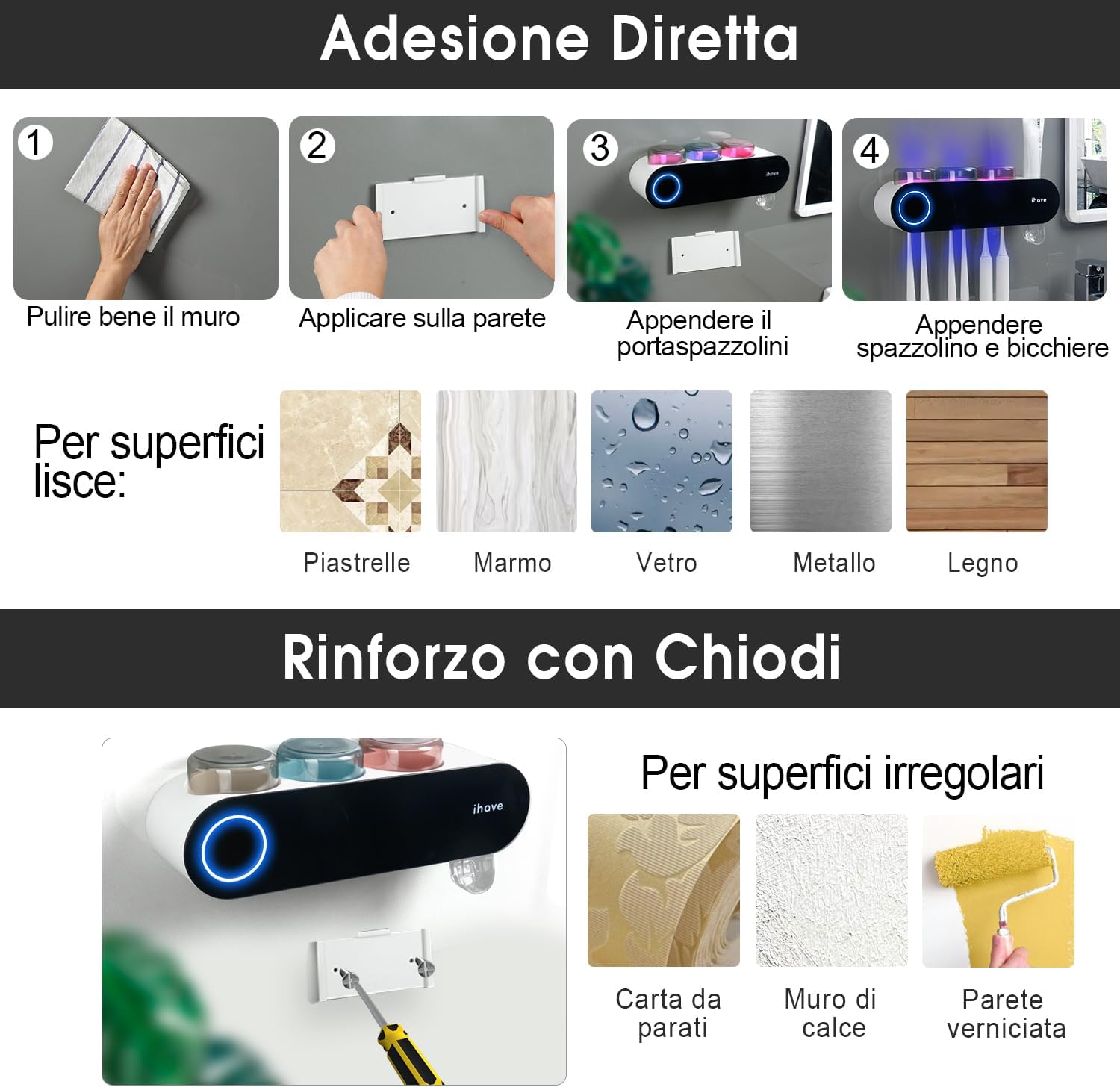 iHave Wall Mounted Electric Toothbrush Holders with 3 Cups, UV Sanitizer, Toothpaste Dispenser, Smart Home Bathroom Accessories & Decor, Black