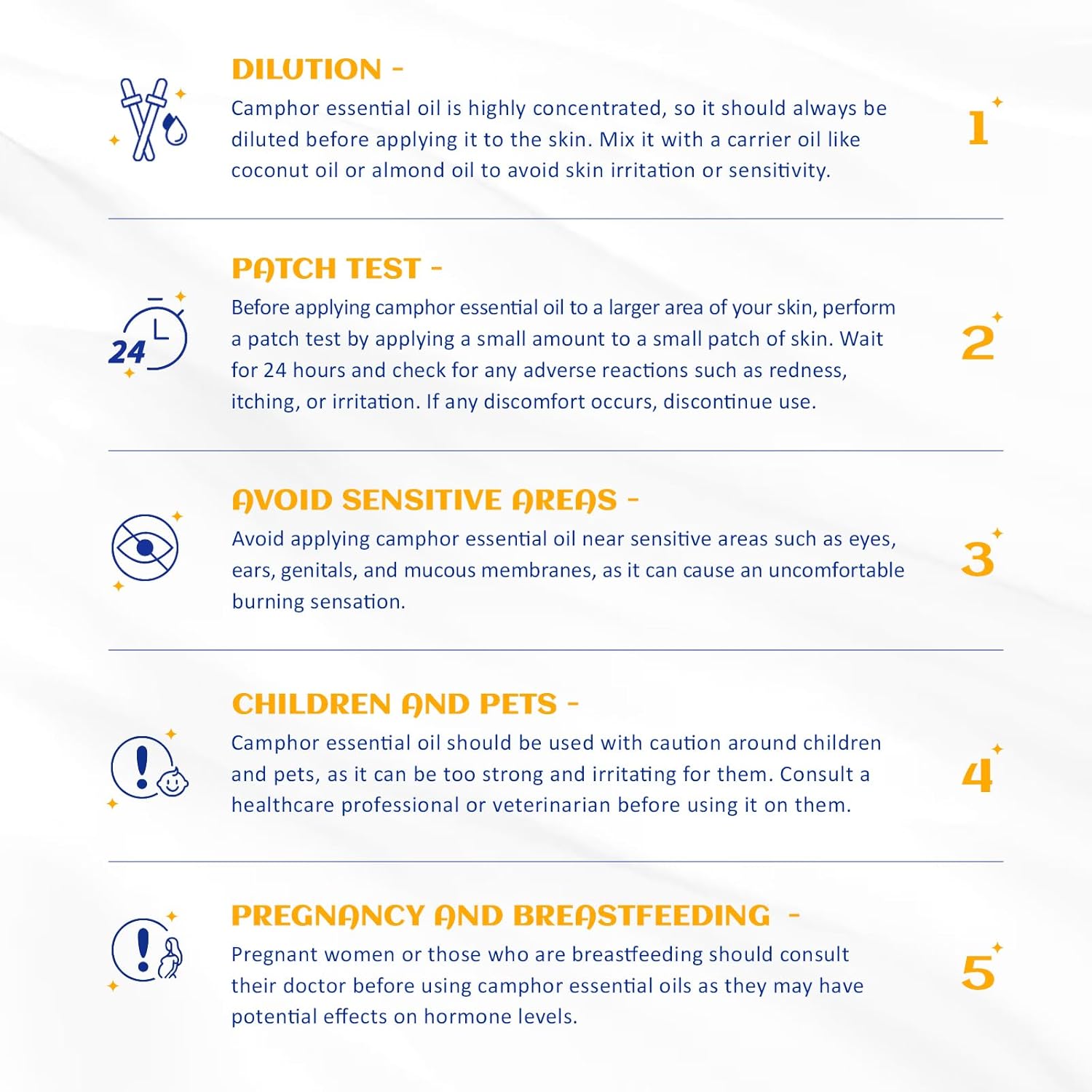 - Body Massage: Mix 1 drop of camphor essential oil with 10 to 20 drops of carrier oil (sweet almond, grapeseed or jojoba). Take an appropriate amount of the oil blend into your palm and apply it in circular motions on the parts of the body that need to be massaged to relax the body and mind