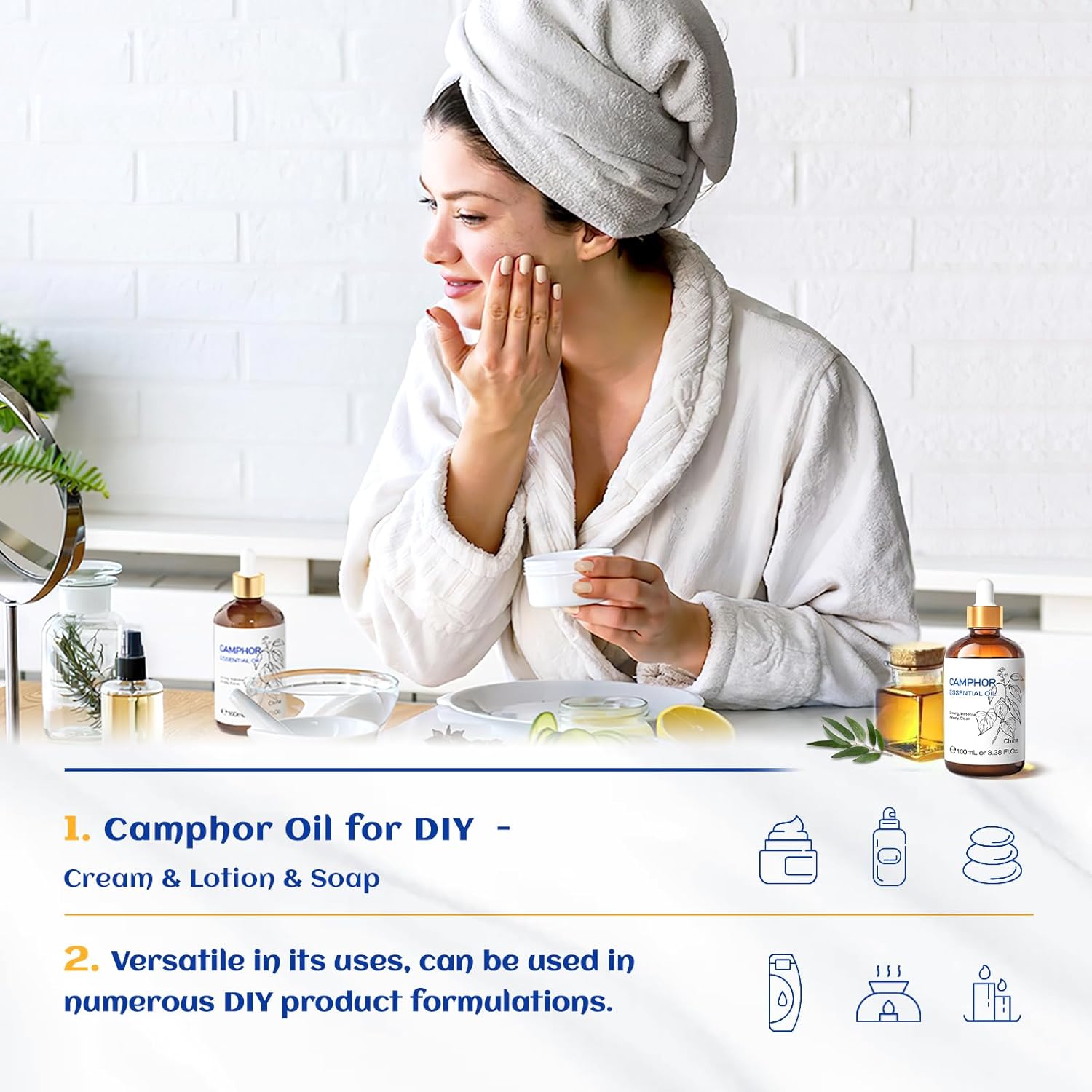 - DIY: Add camphor essential oil to homemade cleaning products, conditioners, shampoos, massage oils, diffusers, cleansers, moisturizer, wool dryer balls, sprays, laundry detergents, cleaners, body lotions, creams, bath salts. Also DIY candles, perfumes, soaps, bath bombs