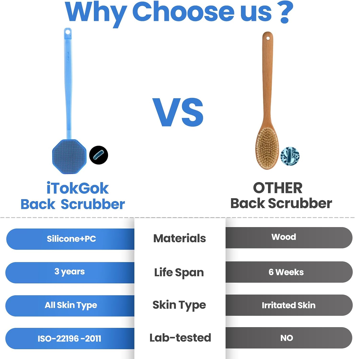 iTokGoK® Silver-Infused Silicone Back Scrubber with Long Handle Back Brush for Shower,Back Brush Long Handle for Men and Women,Ergonomic No-Slip Handle, Long-Lasting (Sky Blue)