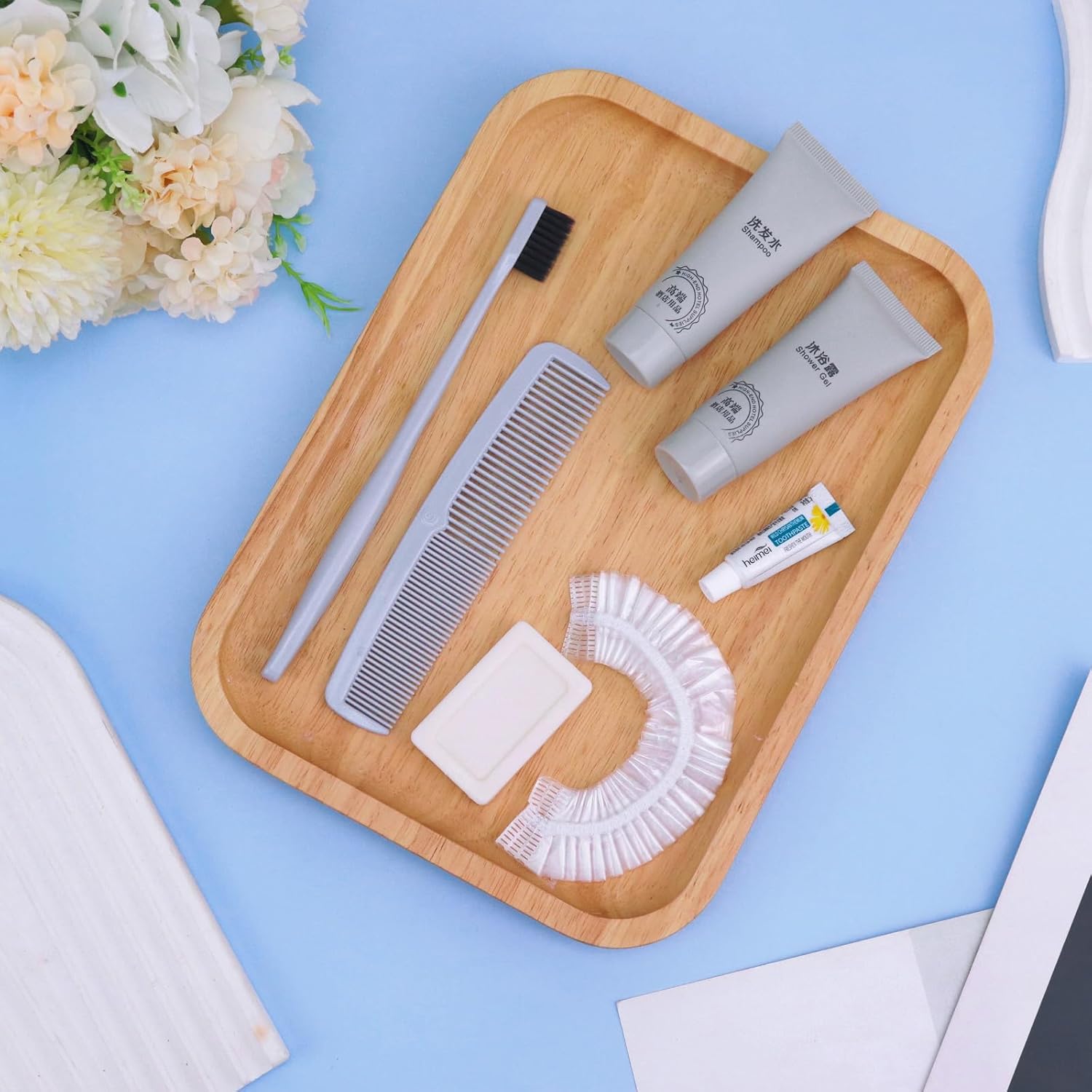 - More sets to match: our hygiene travel kit comes in a pack of 50 sets. Each travel size hygiene products bulk set consists of a Toothbrush, toothpaste, comb, bath gel, shampoo, soap and bath cap. 7 items in a set. personal care travel size toiletries make it even more comprehensive, convenient and comfortable to use.