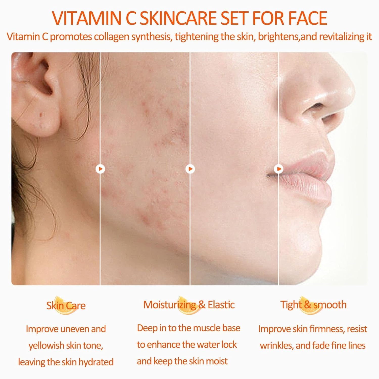 - 🍊Firming and Anti-Aging Benefits: Harness the power of vitamin C, a natural antioxidant known for delaying skin aging and diminishing spots and pigmentation. This skincare set tightens the skin, smooths wrinkles and fine lines, and ensures hydration for delicate and smooth skin.