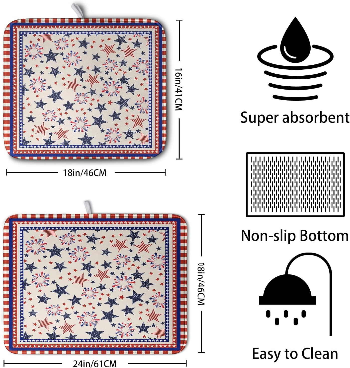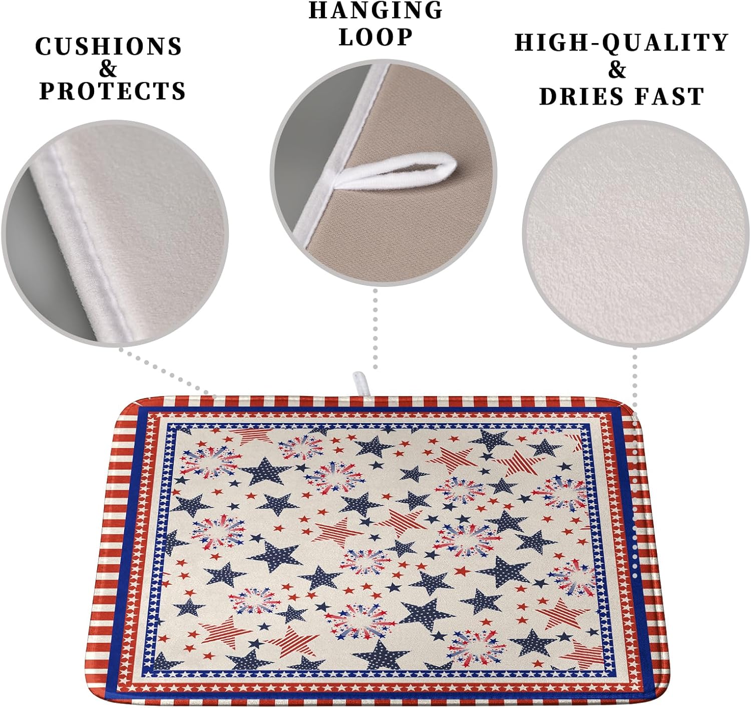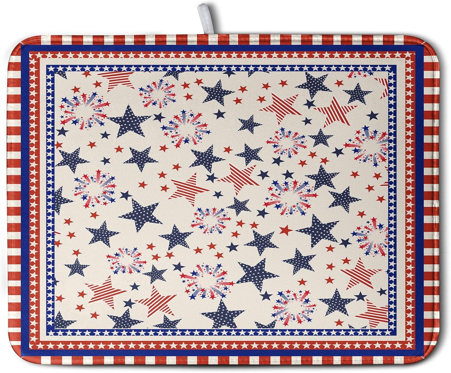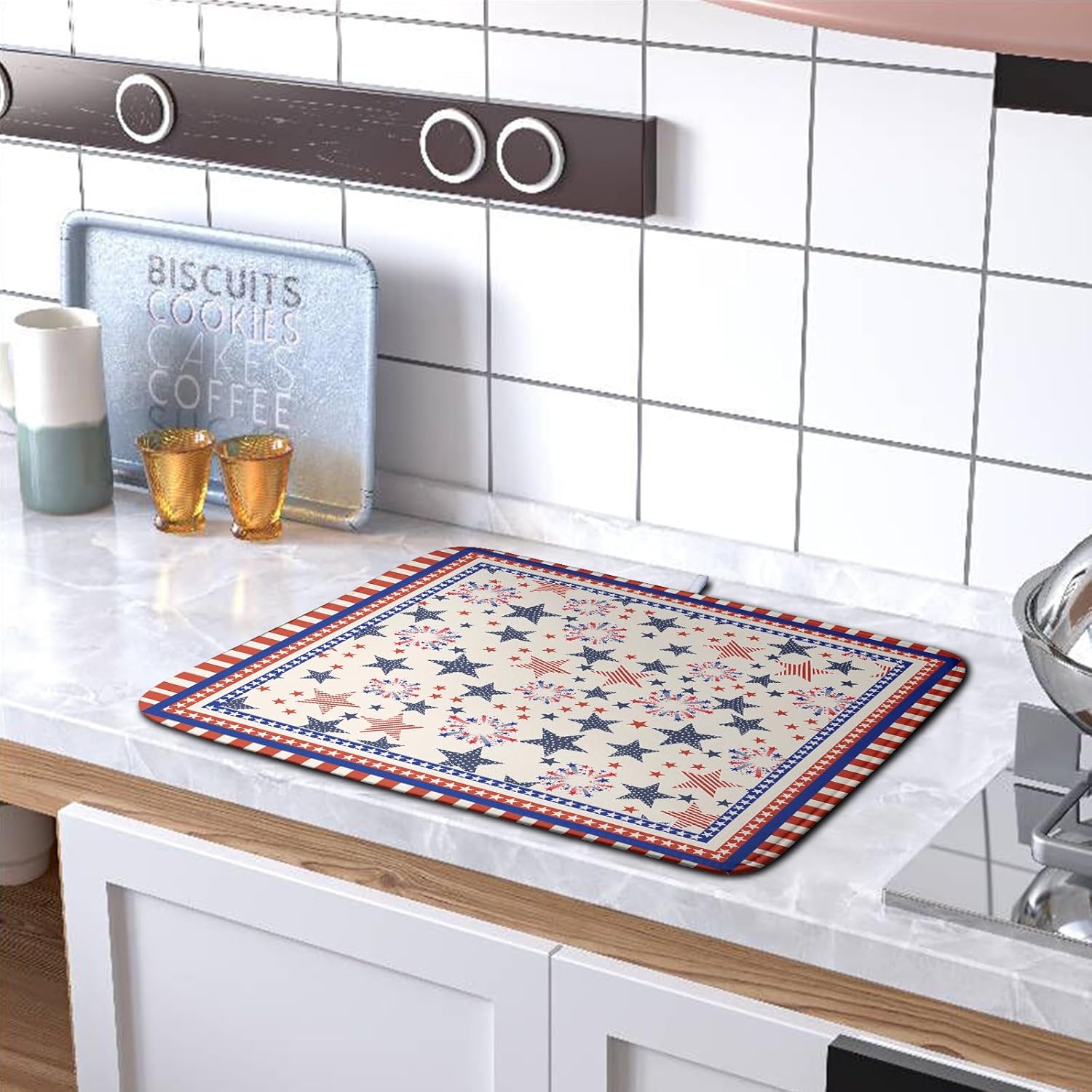 Happy 4th of July Patriotic Dish Drying Mat 18 x 24 Inch US Independence Day Vintage Star Kitchen Drying Mat Blue White Red Dish Drainer Mats Super Absorbent Dish Rack Pad for Coffee Bar Sinks