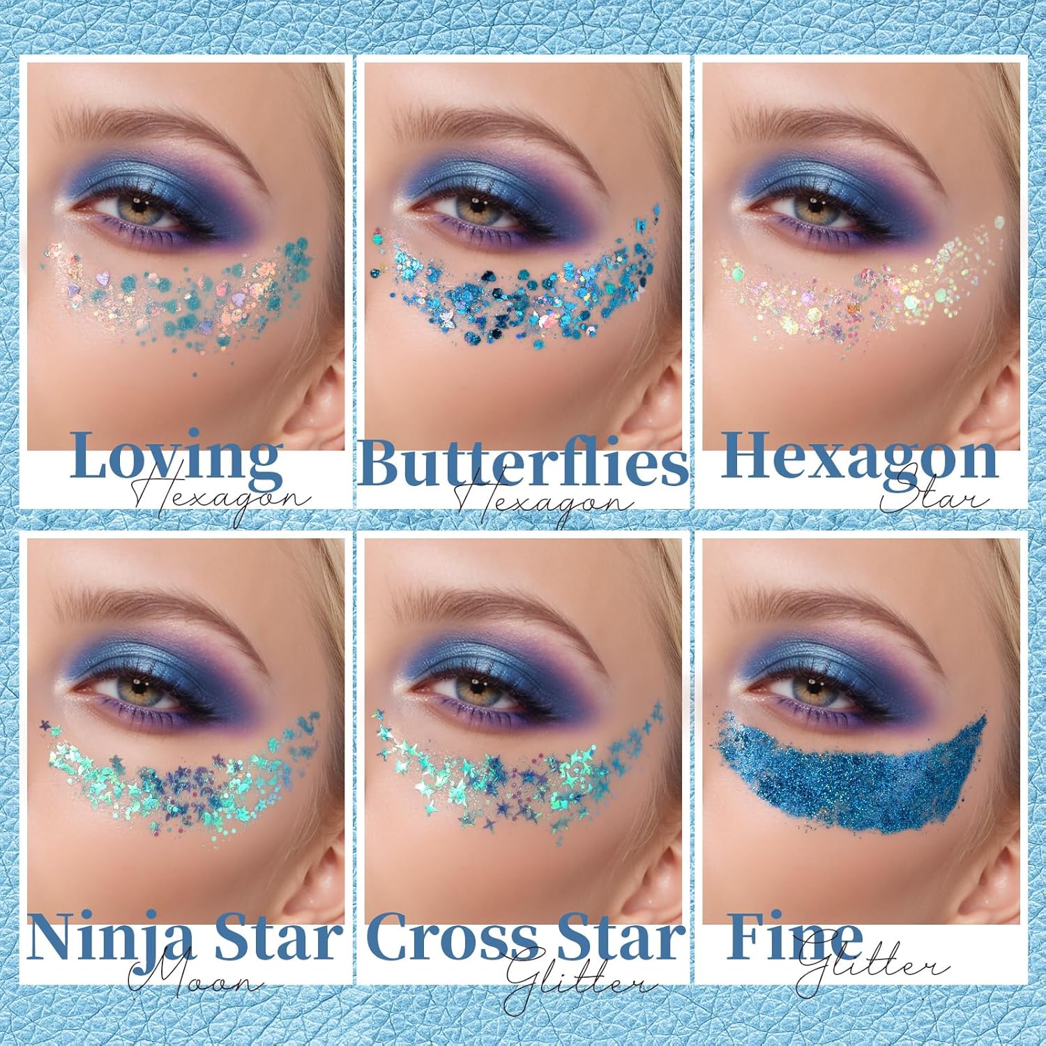 Teenitor Face & Body Glitter - Blue, Hair Glitter Gel, 6 Shapes Festival Makeup Glitter for Face, Hair & Body