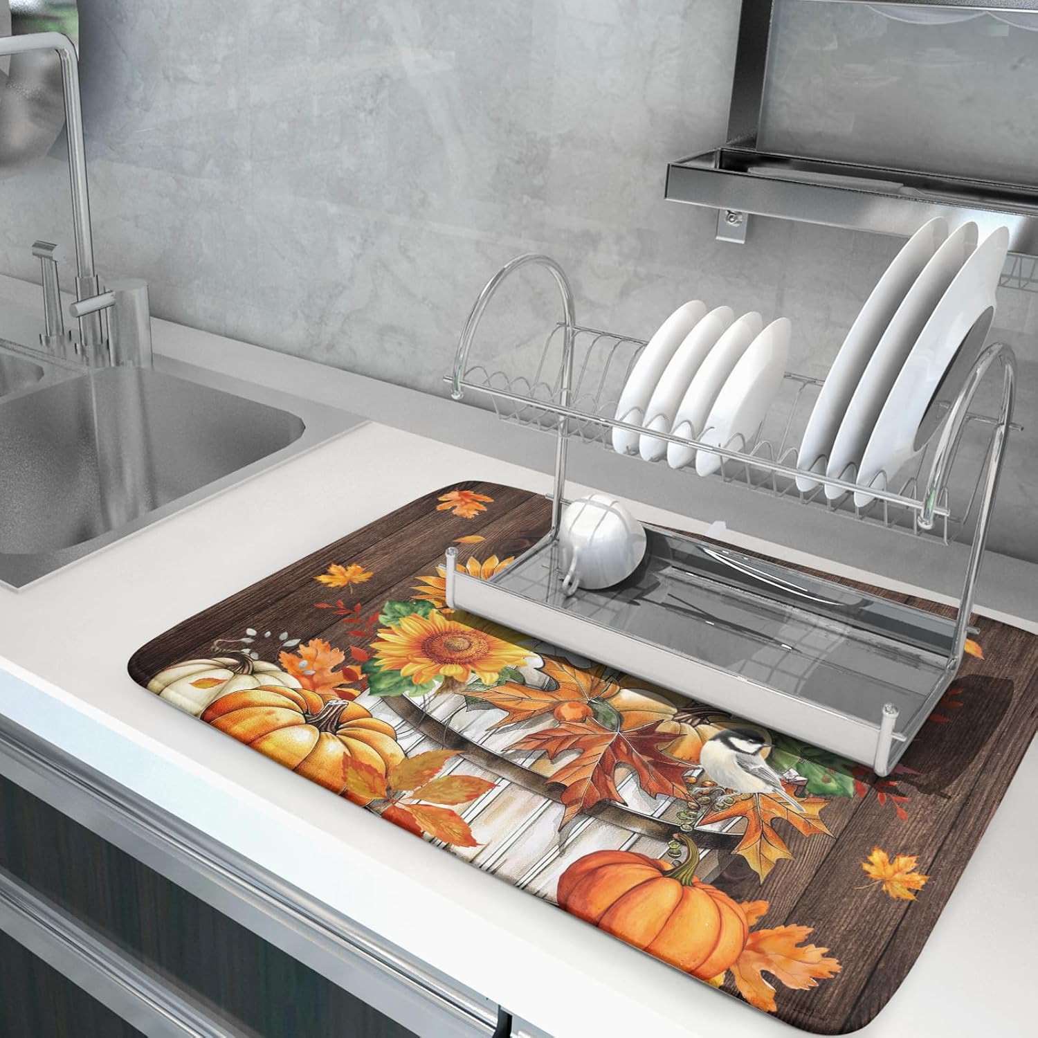 Fall Pumpkin Dish Drying Mat for Kitchen Counter Decor 18x24 Inch Halloween Thanksgiving Dish Drainer Mats Absorbent Reversible Dishes Pad