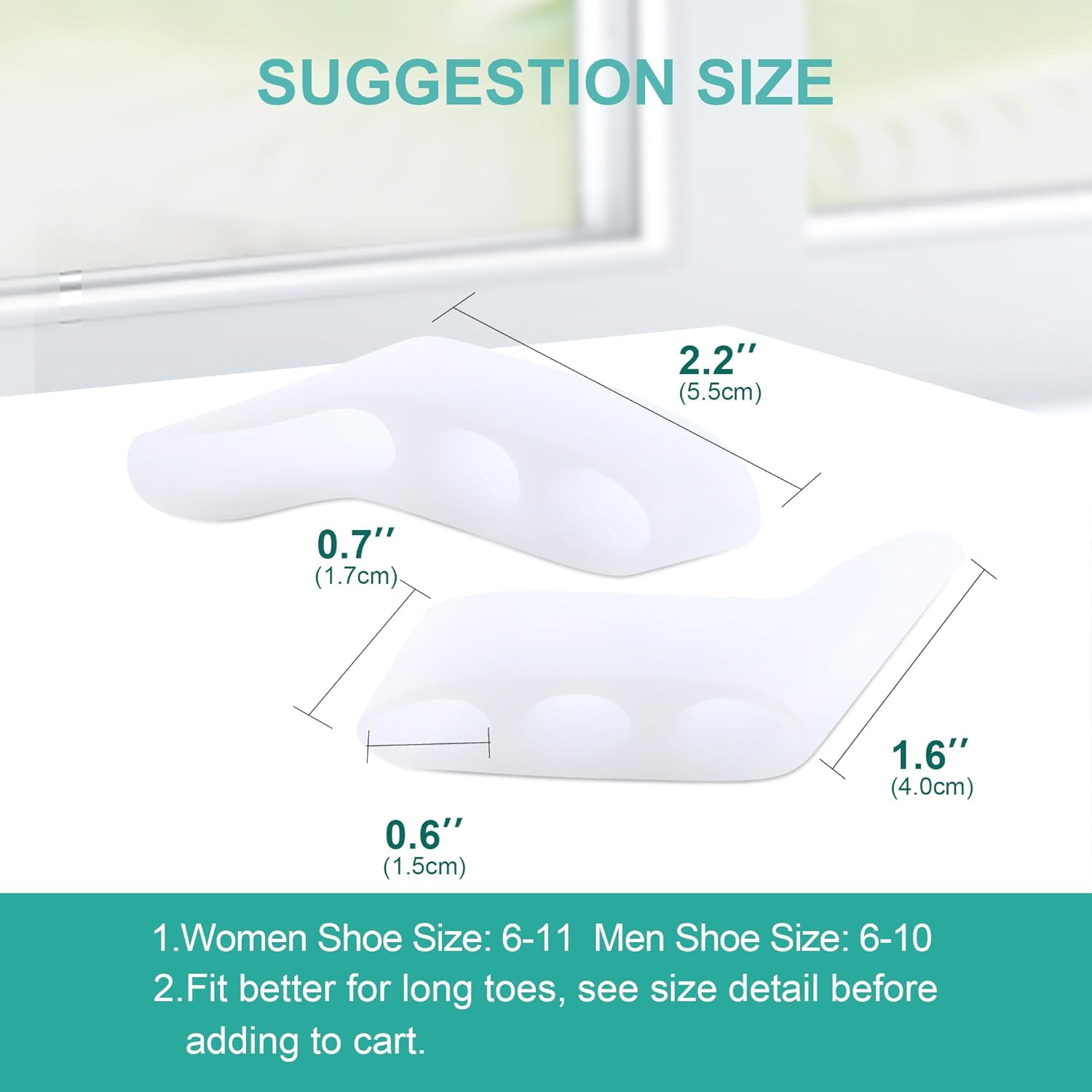 - One size fit most: Suitable for women (US shoe sizes 6-11) and men (US shoe sizes 6-10), each package includes 4 pairs (8 pieces) of pinky toe spacers, offering ample support and convenience.