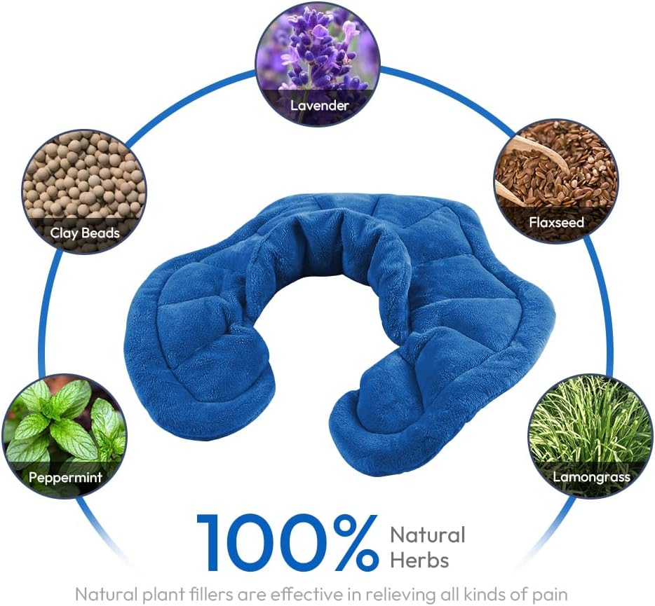 - FILLER HERBS HEAT PAD: Heated neck wrap filled with flaxseed, lavender, peppermint, lemongrass, clay beads to reduce stress and help you relax. Minky fabric moist heating pad cover is soft to the touch and conforms to your neck and shoulders to give you full comfort coverage.