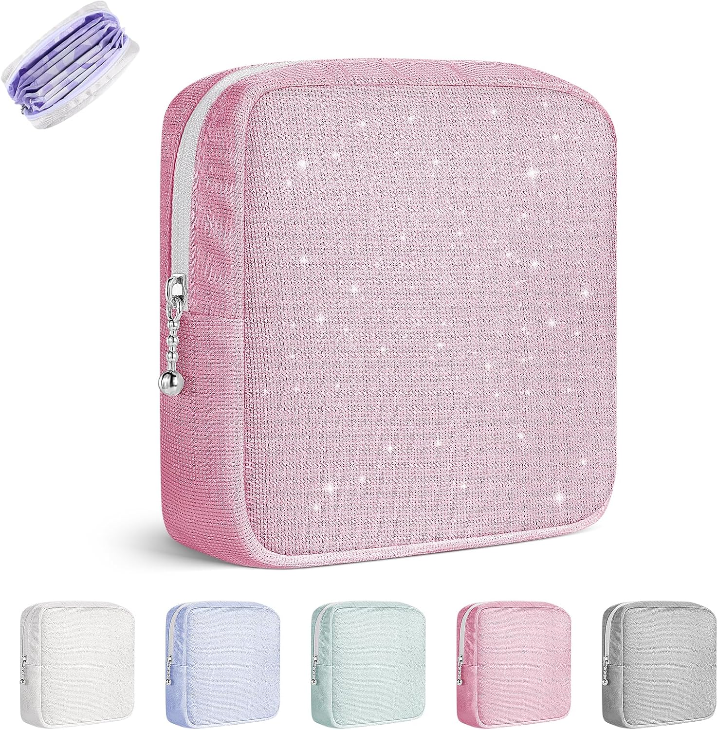 • 【Suitable Size】Measuring: 5.6*5.7*1.3 inches. Glitter sanitary napkin pouch can holds up to 10 normal size sanitary napkins and 4 tampons simultaneously. Whether you are at office, outdoors or traveling, the sanitary pad pouch can easily fit in your bag