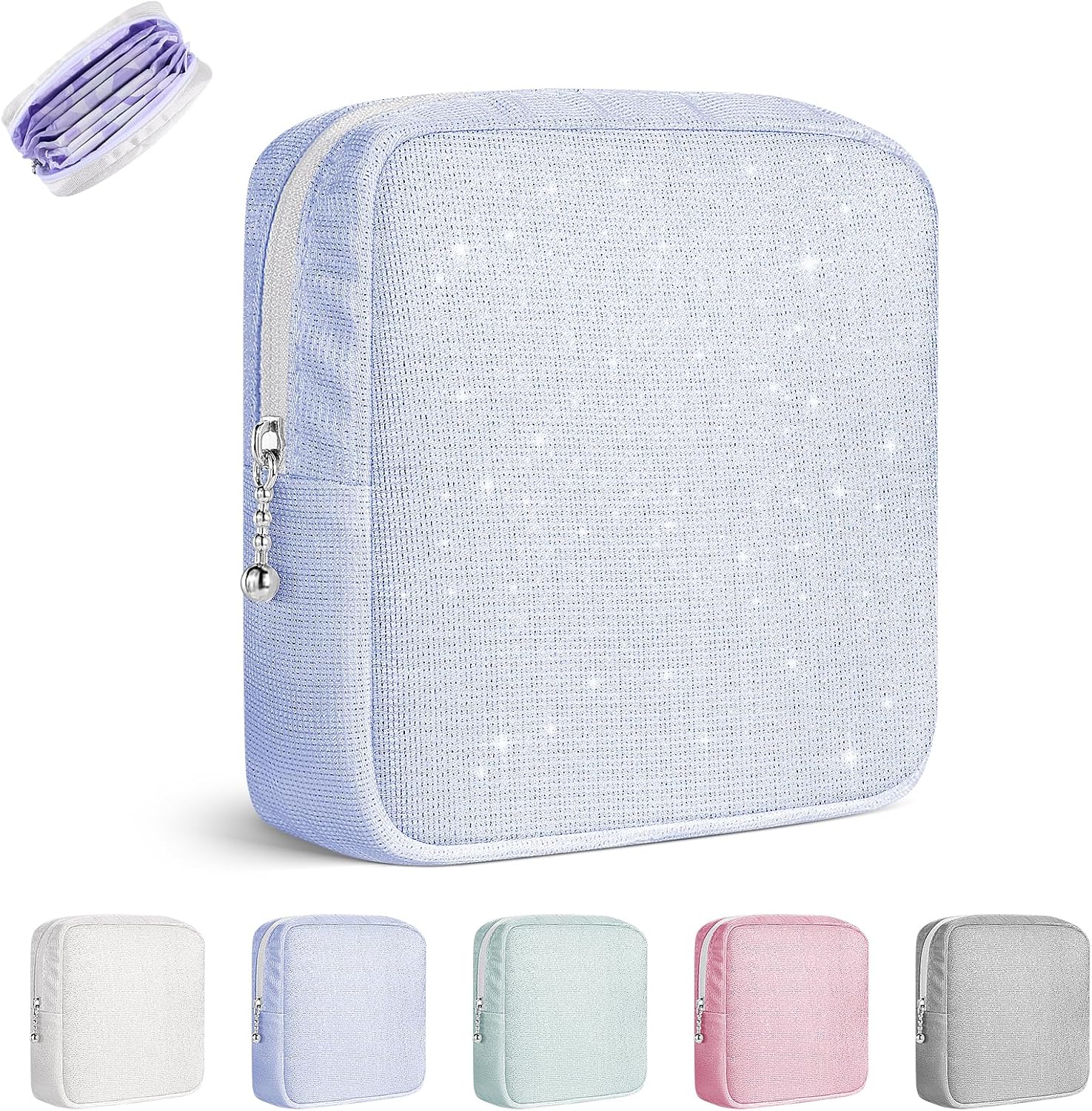 • 【Suitable Size】Measuring: 5.6*5.7*1.3 inches. Glitter sanitary napkin pouch can holds up to 10 normal size sanitary napkins and 4 tampons simultaneously. Whether you are at office, outdoors or traveling, the sanitary pad pouch can easily fit in your bag