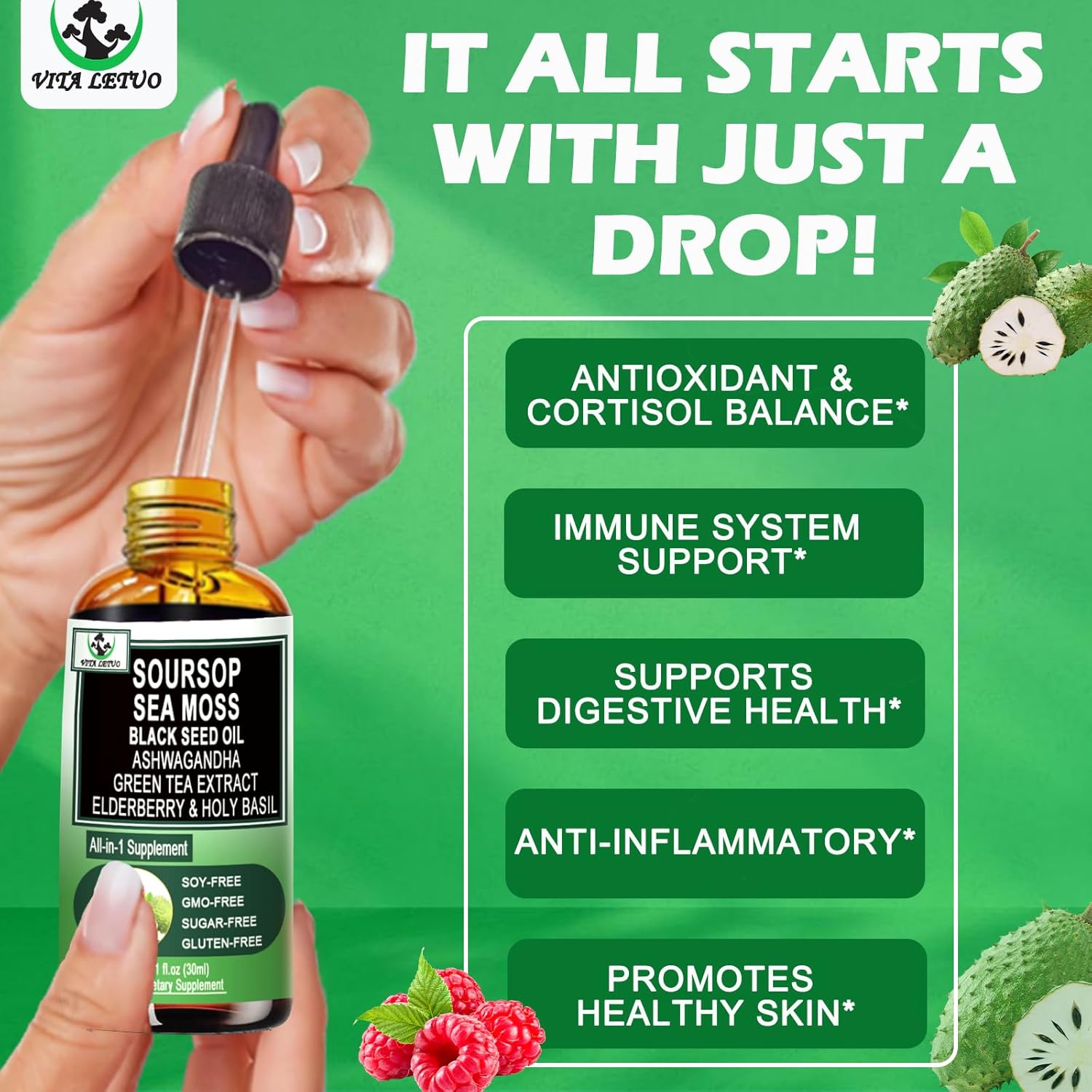 Soursop Drops,Soursop Bitters Liquid with Sea Moss Black Seed Oil Green Tea Extract Ashwagandha Elderberry Holy Basil-Multimineral&Vitamins Superfood Drops for Immune&Digestive & Cell Support