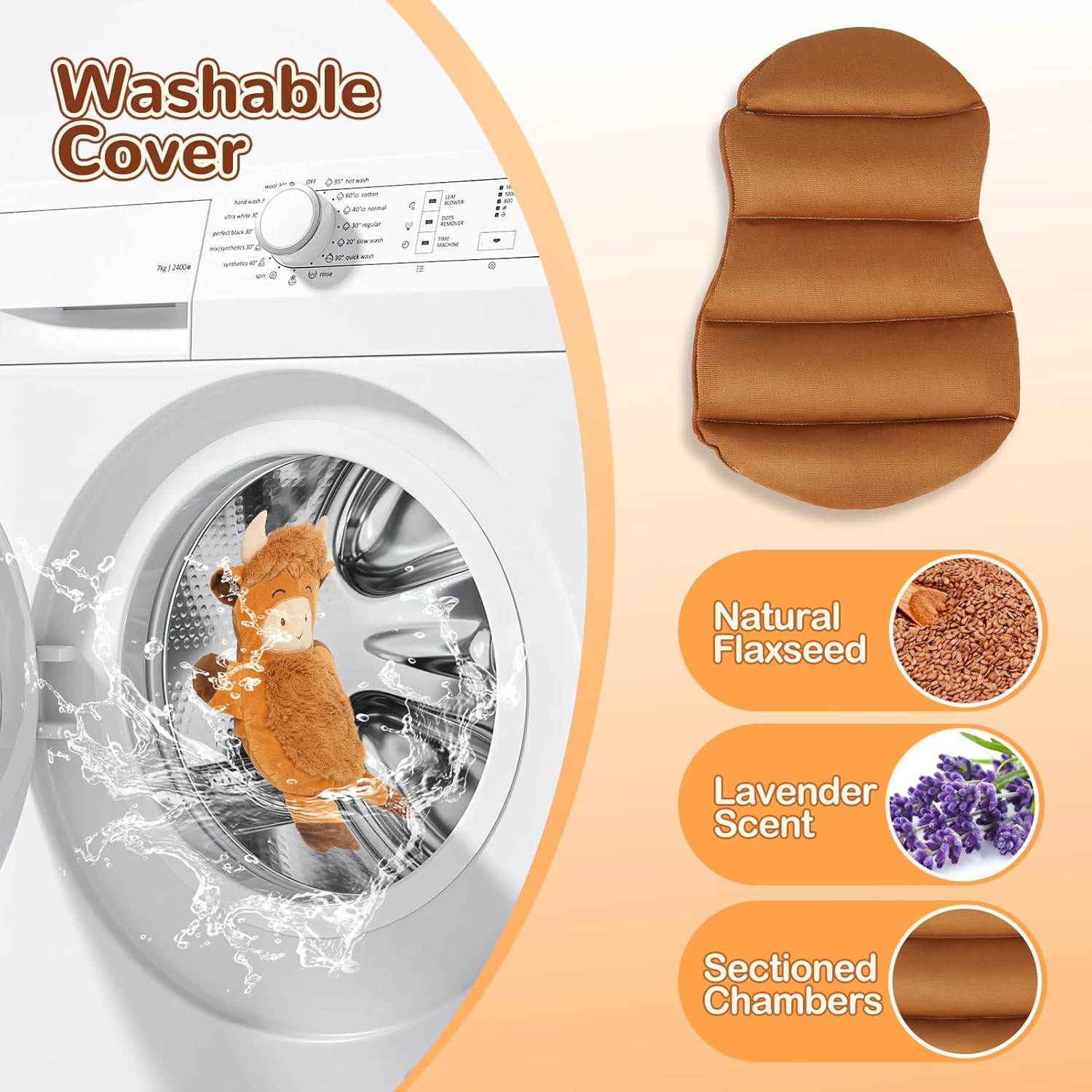 - An Adorable Highland Cow Aura, A Cuddly Heating Pad: Simply put the heating pad into the microwave oven for 60 seconds, and you’ll be instantly surrounded by the cozy and moist warmth for as long as 20 minutes. Why not say goodbye to the messy unpacking procedure of traditional heat pad? We provide a whole new experience!