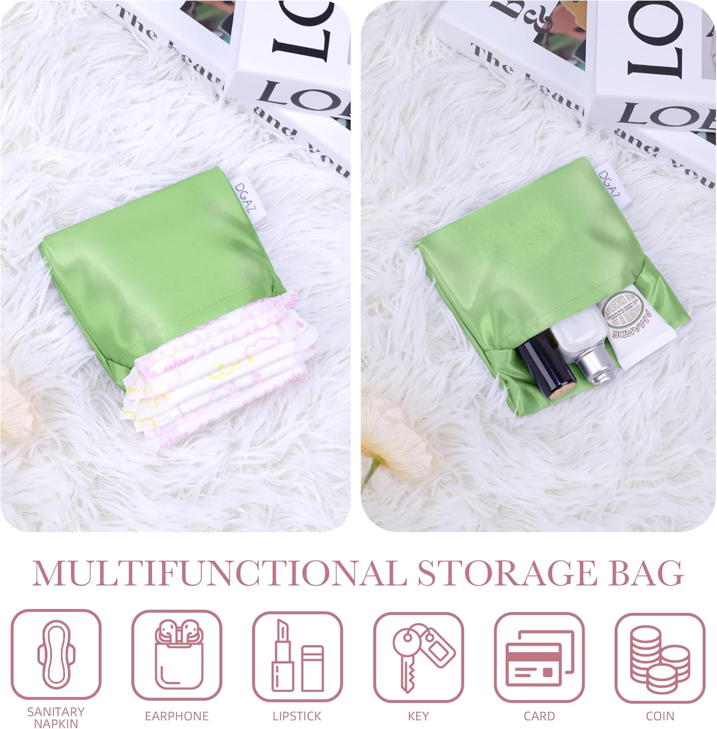DGAZ Silk Sanitary Napkin Storage Bag, Period Bag for Teen Aged Girls, Portable Period Bag for Panty Liners/Menstrual Cup/Small Tampons,Mini Makeup Bag for Purse(Vert Criquet)