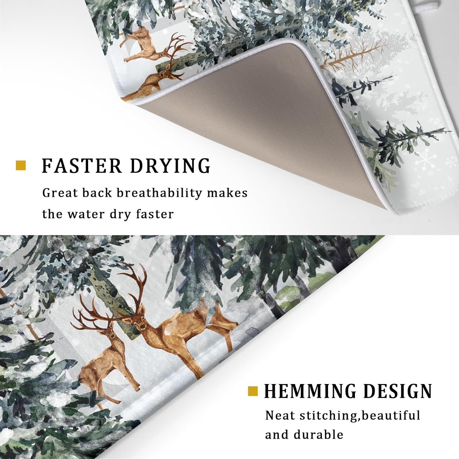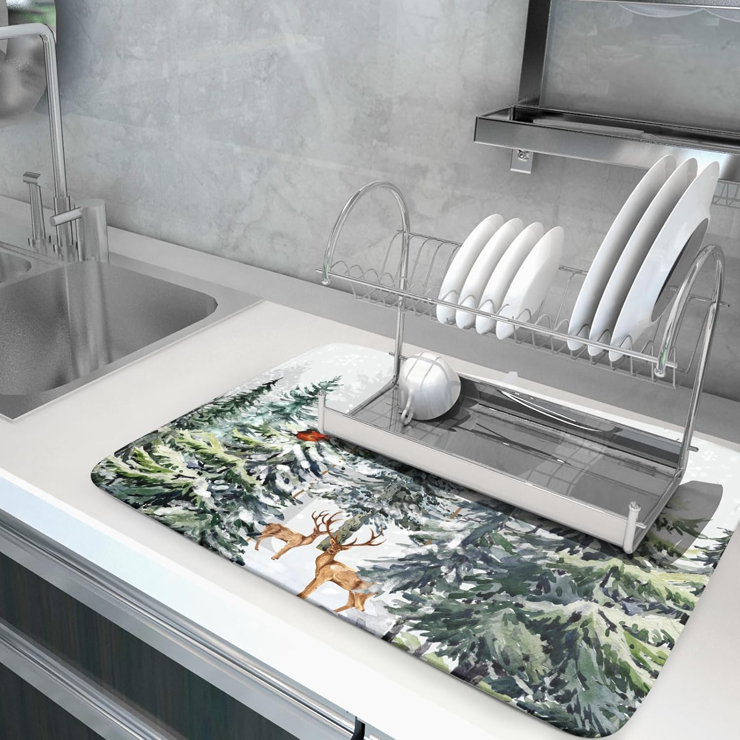 Pine Tree Dish Drying Mat for Kitchen Counter 18x24 Inch Forest Deer Absorbent Dishes Drainer Mats Reversible Microfiber Quick Dry Rack Pad