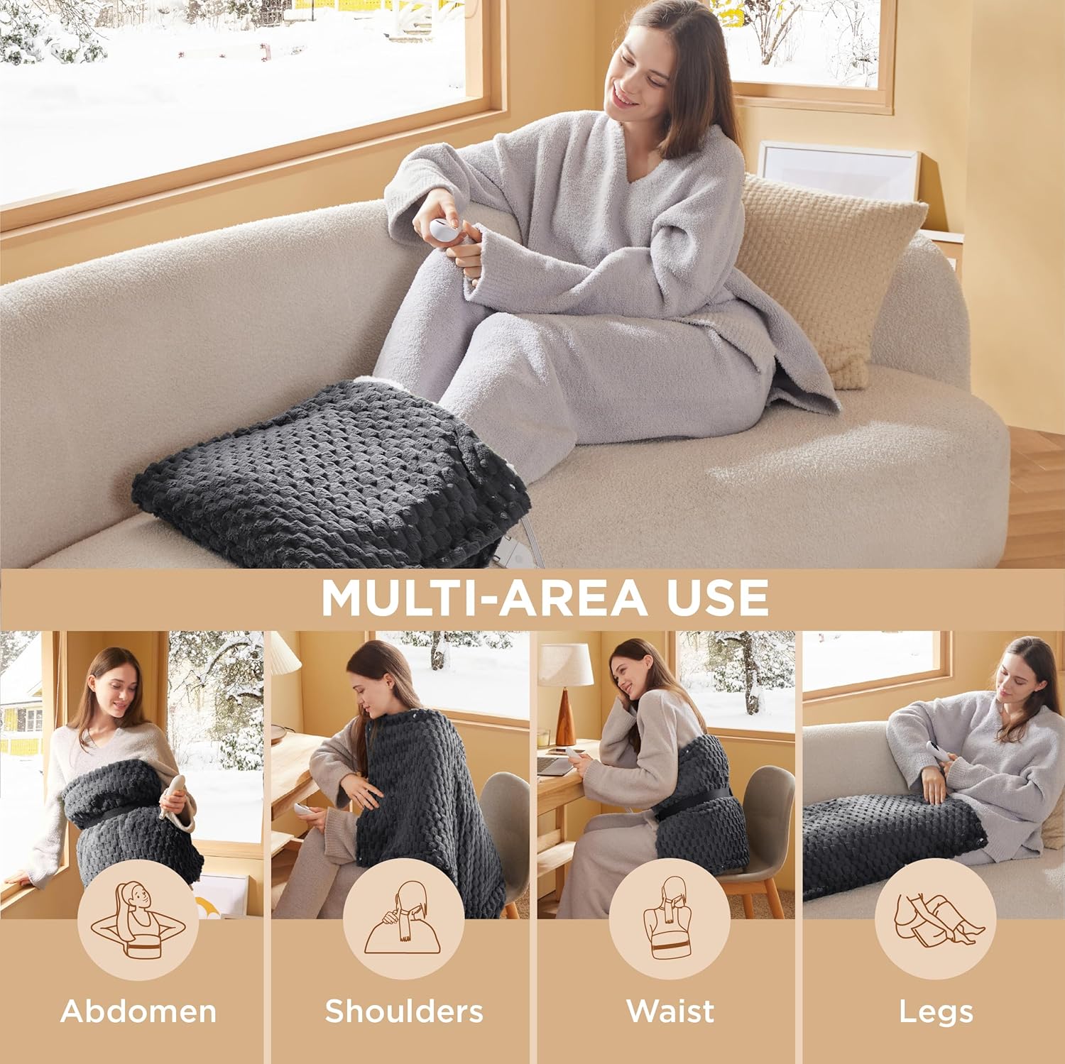 - Thoughtful Details: Equipped with a waist belt for secure positioning and easy movement, this heating pad features multiple snap buttons for a customizable fit. It also comes with a detachable sherpa foot warmer for added warmth