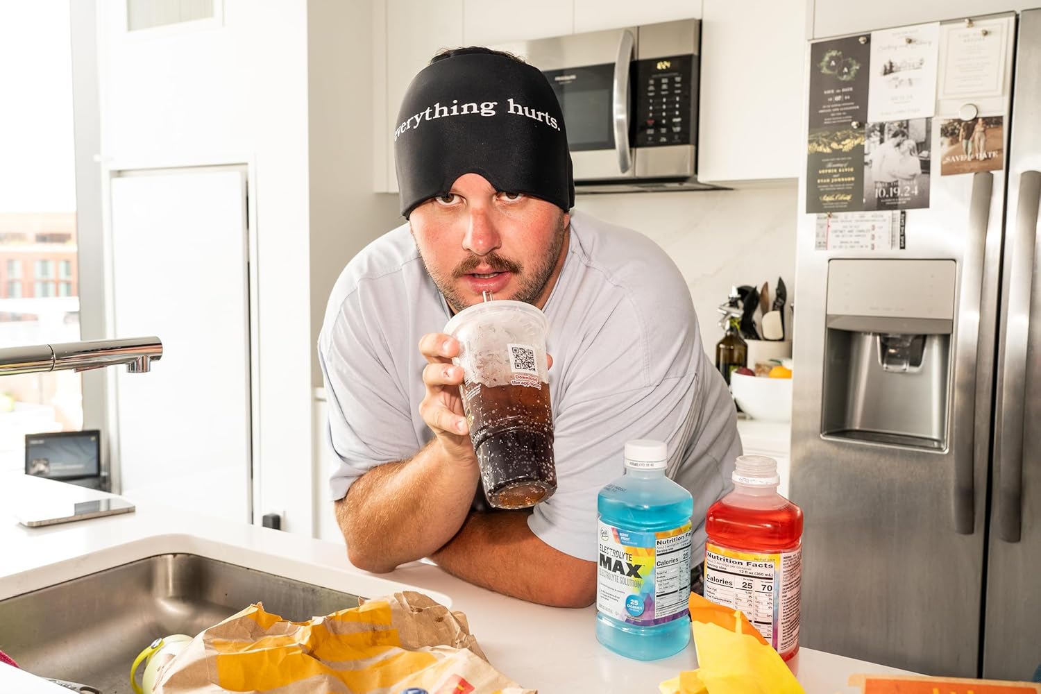 - Each hugg is made of soft, squishy, silicon gel that offers a cool, soothing remedy to your post drinking symptoms. the stretchable design ensures a snug and comfortable fit for all head sizes, and it is safe to wear on bare skin.