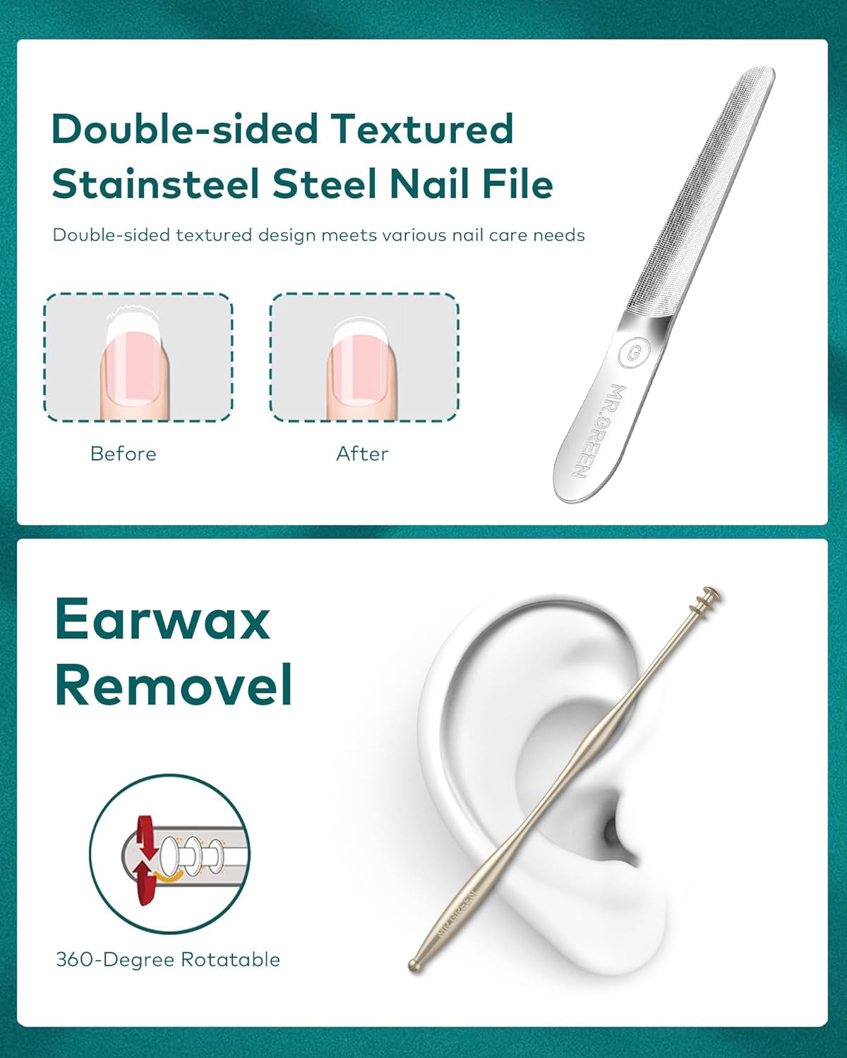 - Multifunctional 5PCS Nail Clippers: MR.GREEN nail clipper set includes a ultra-thin fingernail clippers, a Tweezers, a nail file and a scissors, with a variety of colors and styles to choose from, to meet all your daily needs.