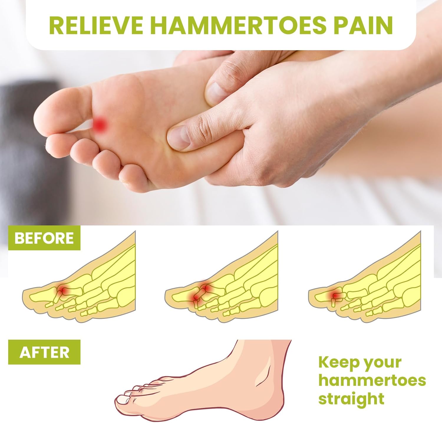 - Pain Relief with Gentle Pressure - Hammer toes can cause the second, third or fourth toe to bend or overlap uncomfortably, which can cause discomfort during movement, activity or friction. Hammertoe silicone provides cushioning and support for the toes, relieving toe pain. In addition, they help relieve pressure and pain caused by corns, calluses, injuries and more.
