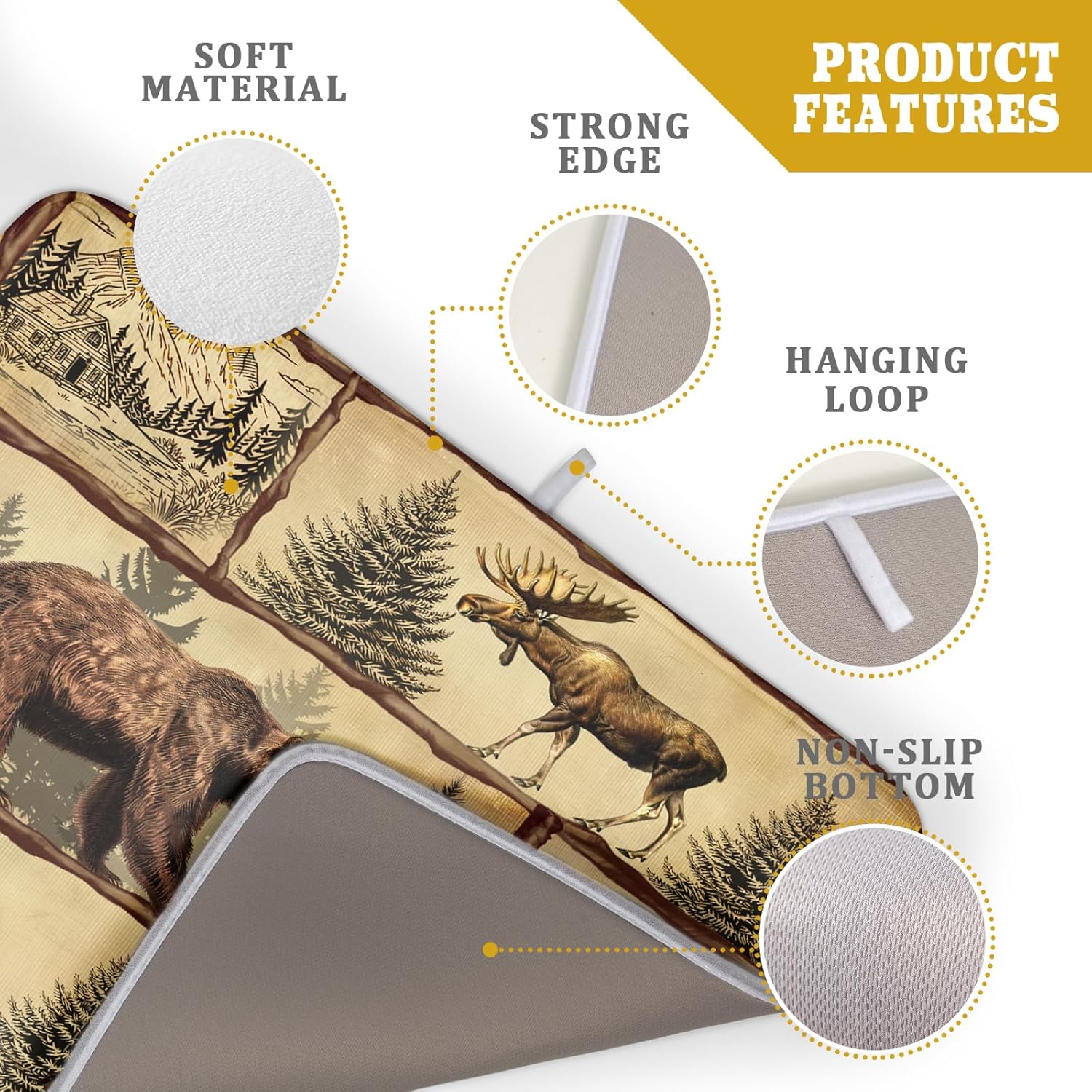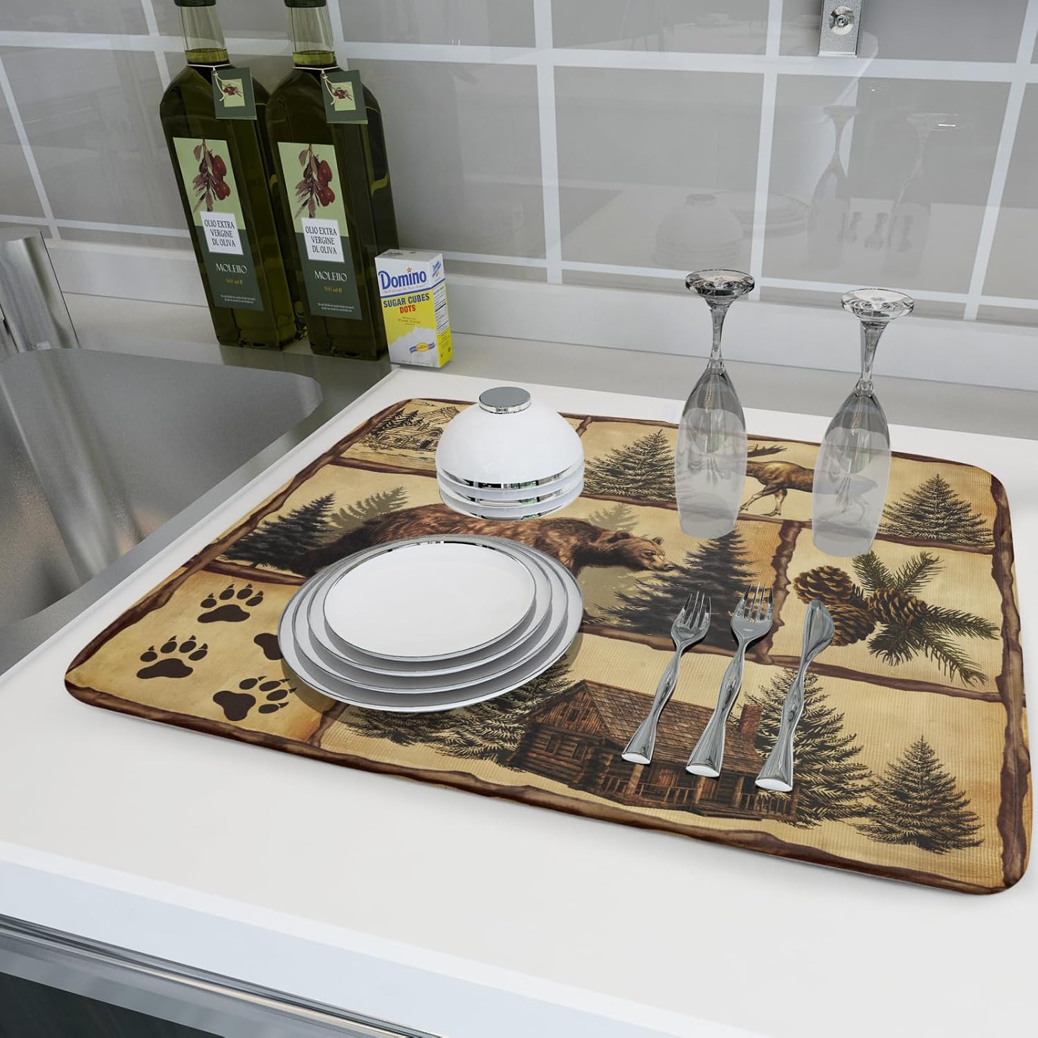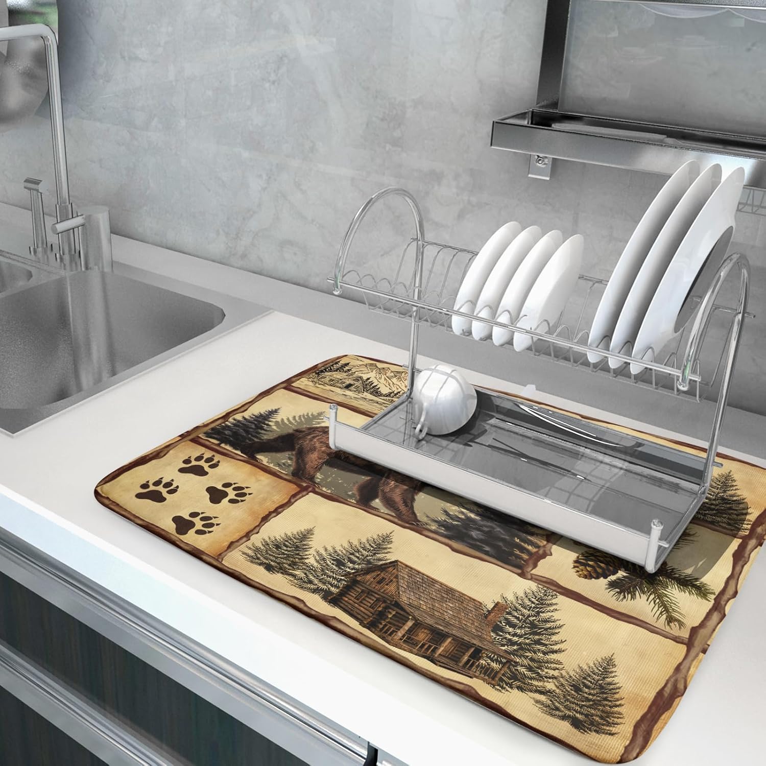 Vintage Bear Moose Dish Drying Mat 18x24 Inch Country Cabin Absorbent Dish Draining Mat Heat Resistant Drying Pad for Counter Sink Home