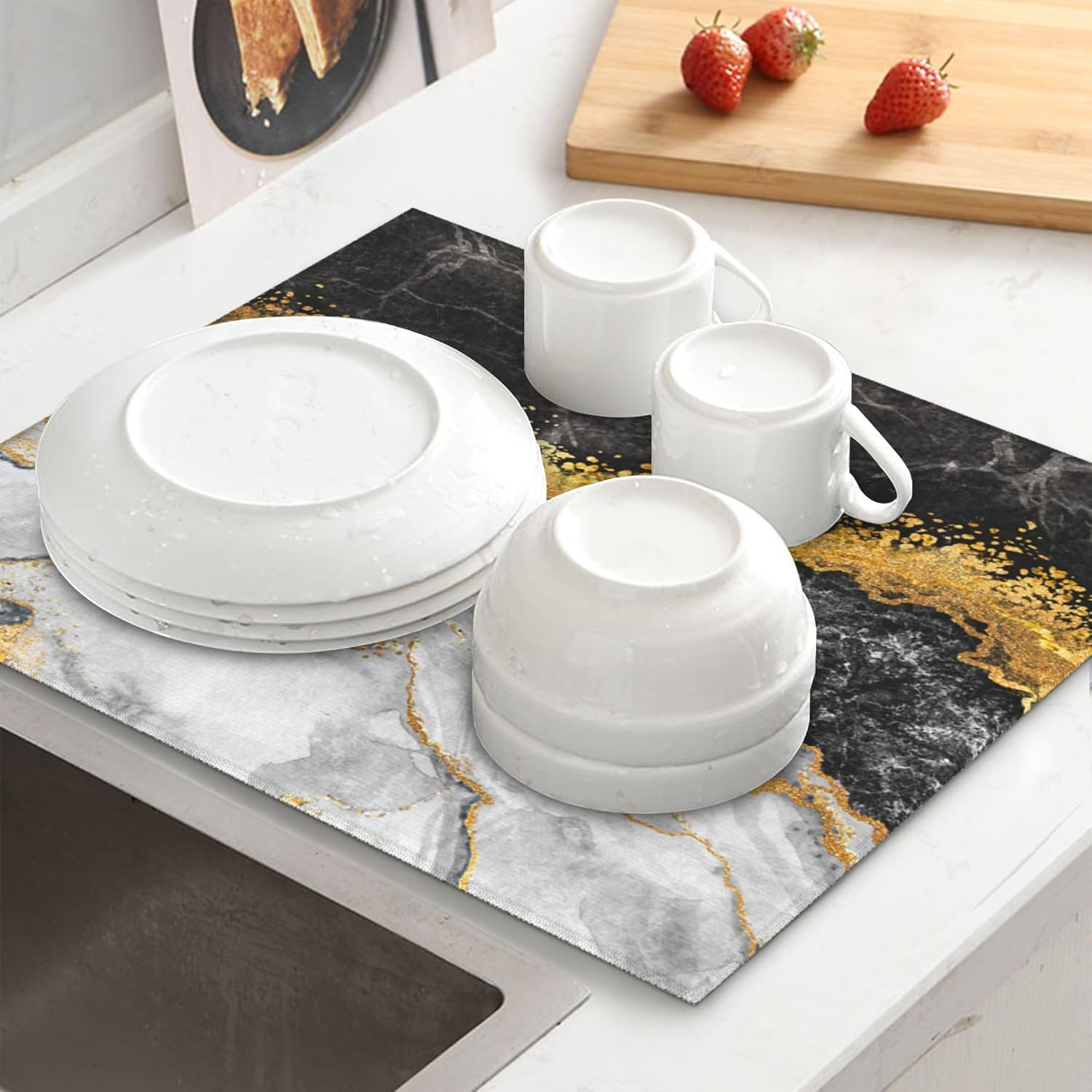 Black Gold Marble Dish Drying Mat for Kitchen Counter Gold and Black Grey Dish Drainer Rack Mats 16x18 Inches Absorbent Reversible Cute Drying Pad