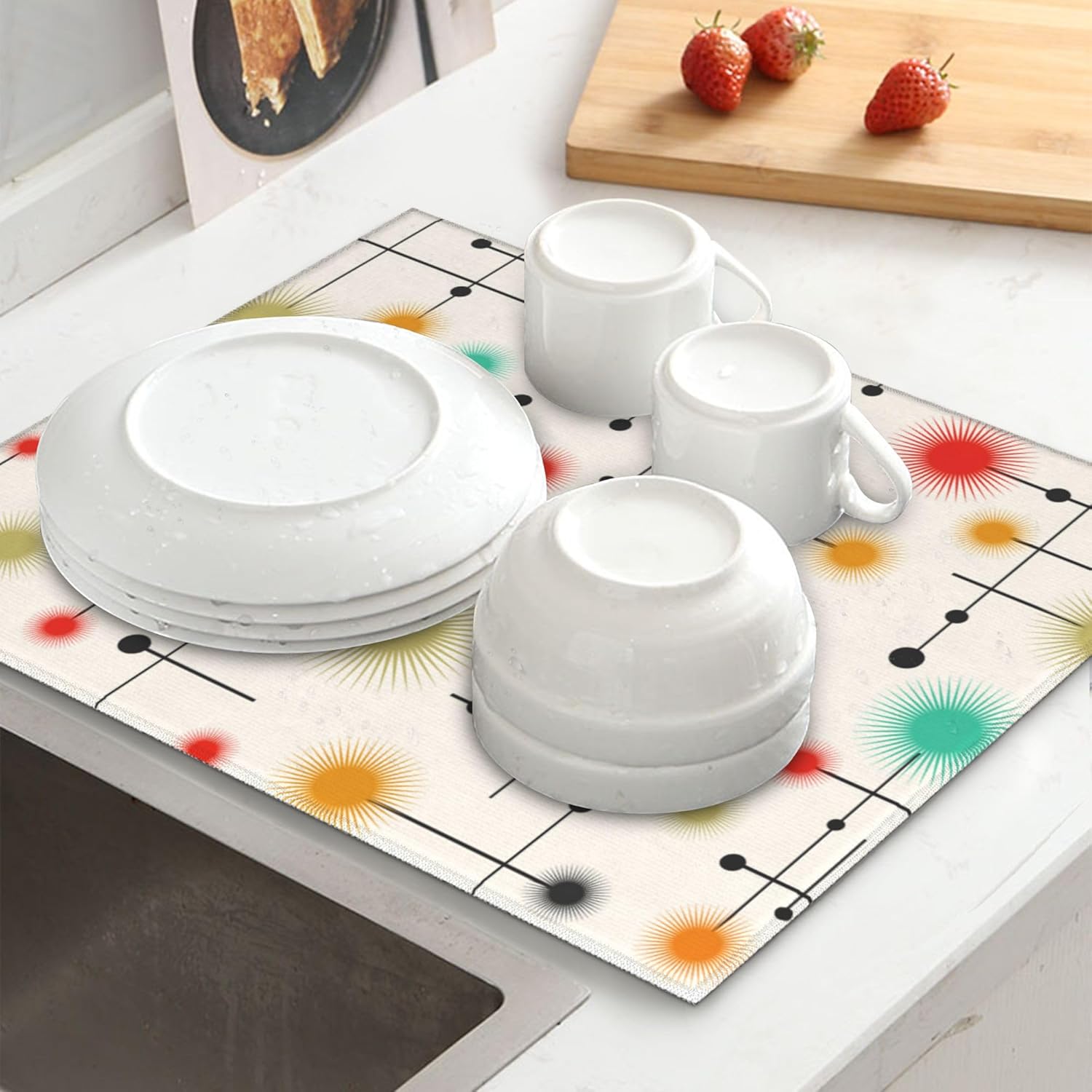 - Cute print can easily dress up your kitchen dining room. Drying pad suitable for draining racks to keep the counter dry and clean, or you can place pans, bowls, plates, pots, cups, bottles, tableware, ect