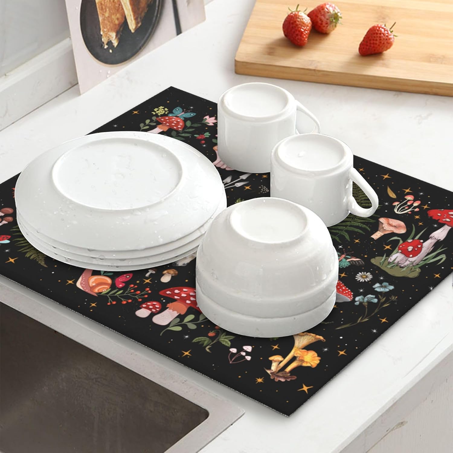 Mushroom Dish Drying Mat for Kitchen Counter Moth Gothic Witchy Dish Drainer Rack Mats 16x18 Inch Absorbent Reversible Black Drying Pad