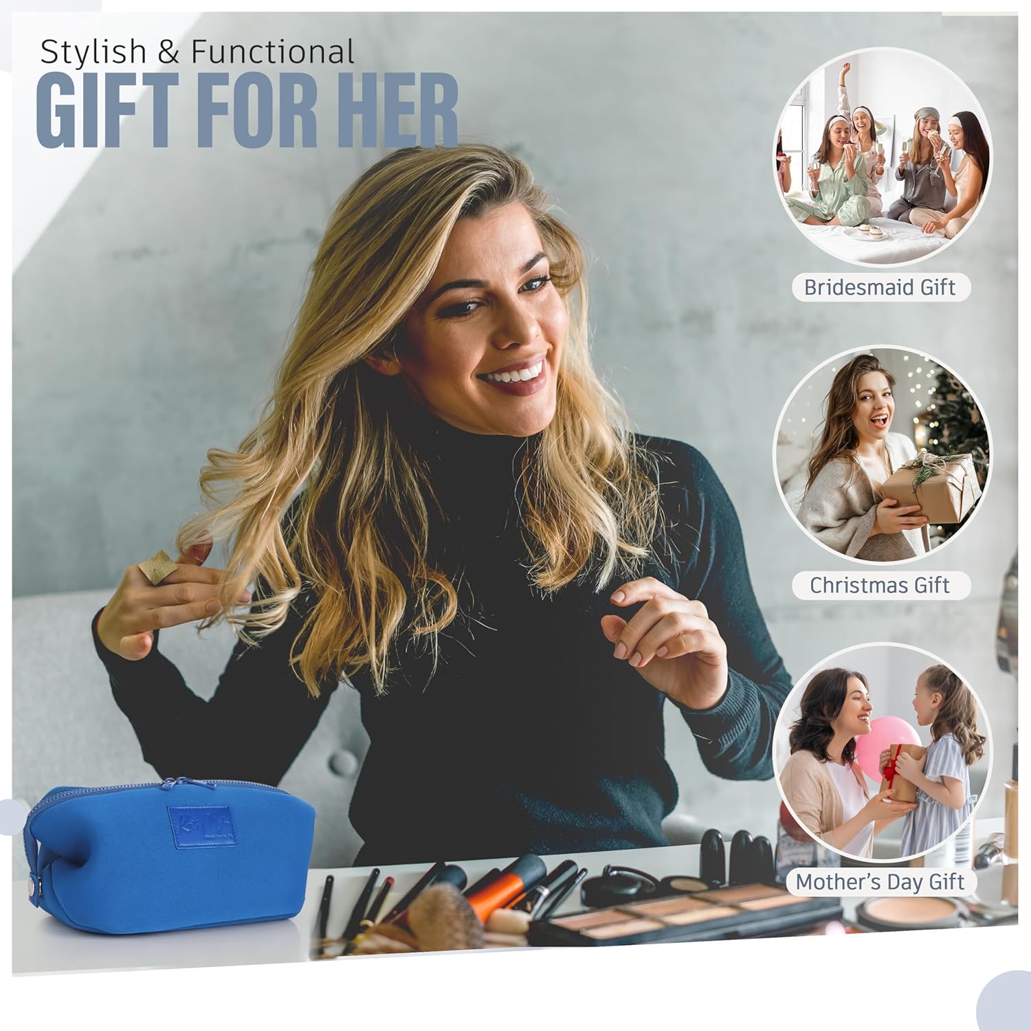 - Durable and Long-Lasting: The neoprene material ensures durability and versatility for modern travel needs and everyday use. Compact and portable cosmetic bag: The sleek design makes it easy to carry your makeup and cosmetics while traveling.