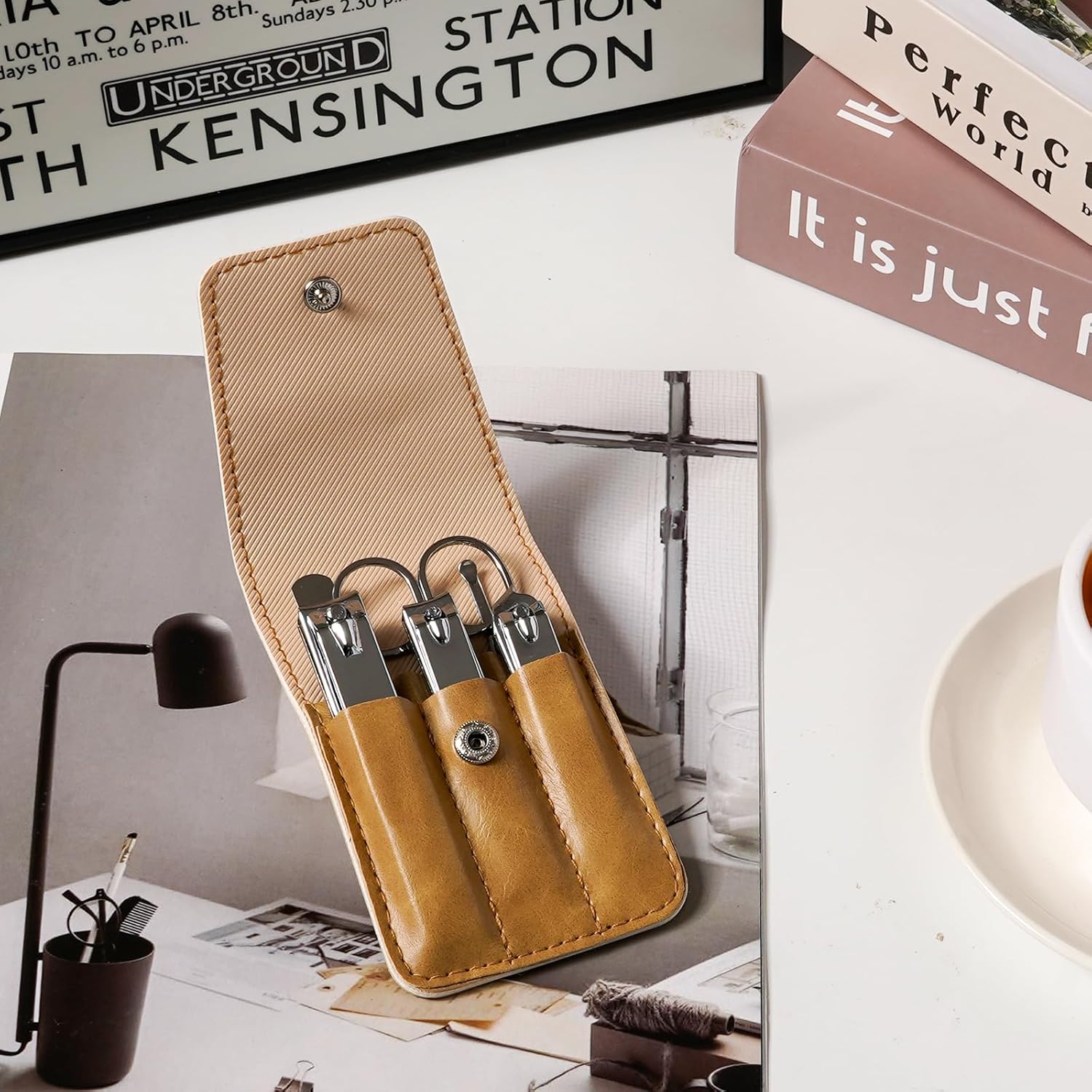 Premium Stainless Steel Nail Clippers Set - Travel Grooming Kit, 6pc Manicure/Pedicure Tools with PU Case - Unisex Gift for Men and Women(D-Khaki)