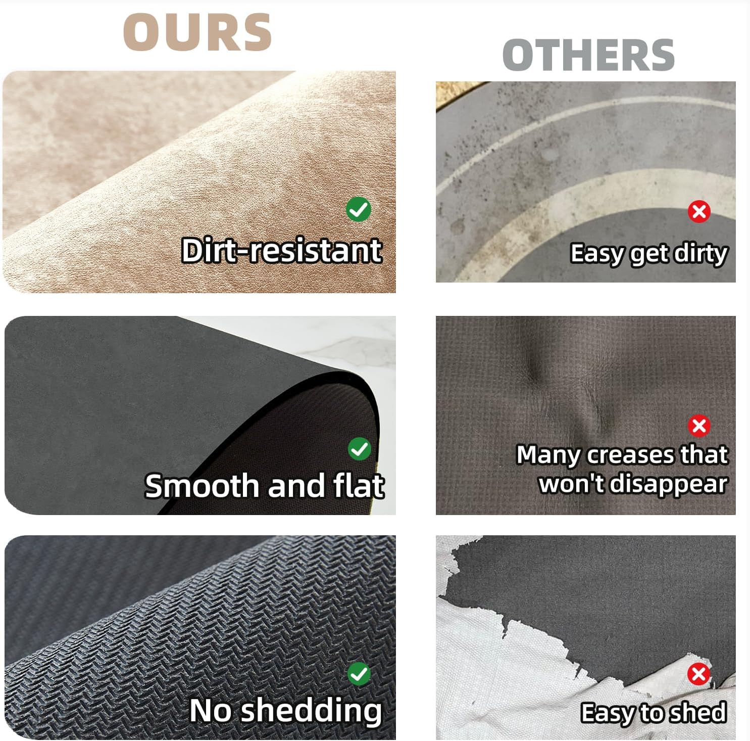- Easy to Care: Thanks to the hairless new-tech layer, these bathroom mats are easy to clean. Water evaporates quickly, preventing dirt and hair from attaching to the surface. No need machine wash. After long-term use, simply wipe it with a wet cloth, rinse it with a shower nozzle or use vacuum cleaner. And dry it in open air after washing.To ensure it has a long life time, please do not use of dryer or bleach cleaning