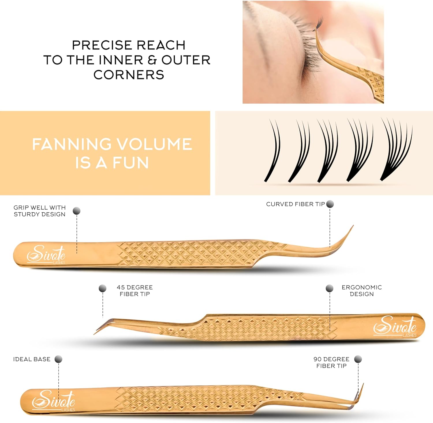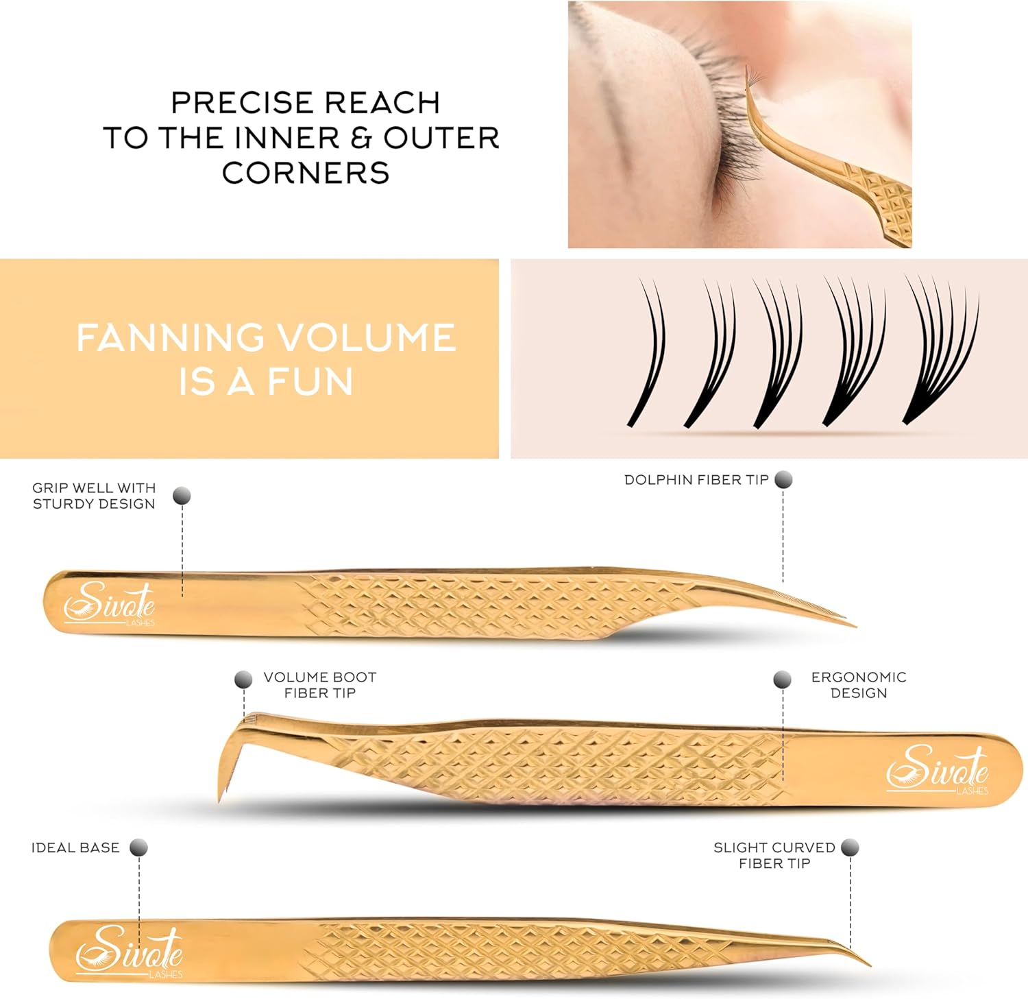 SIVOTE Eyelash Extension Tweezers Fiber Tips Japanese Steel, Set of 6, Curved, Dolphin, 90 Degree 45 Degree, Volume Boot & Slight Curved Tweezer, Gold