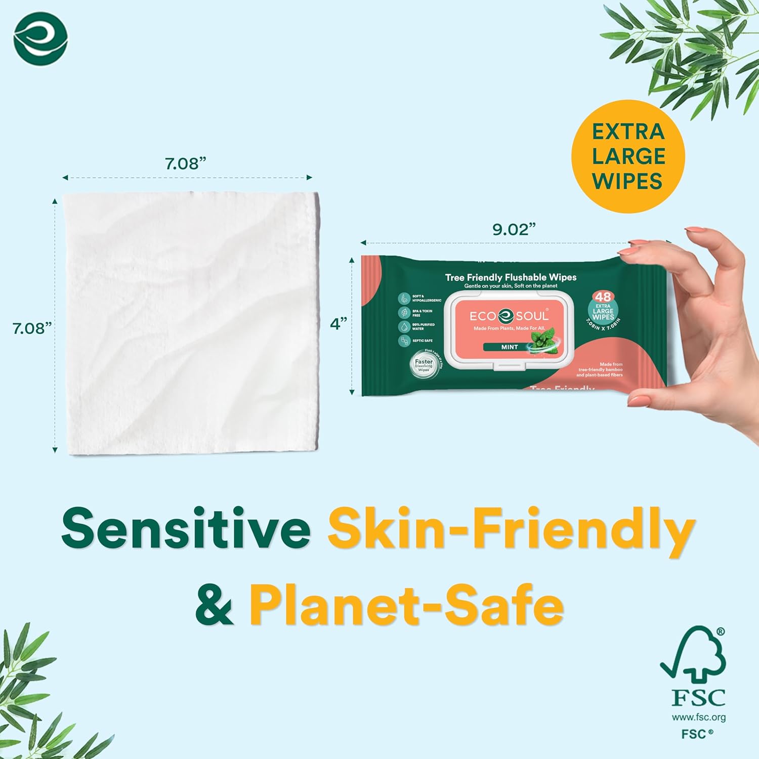 ECO SOUL Bamboo Flushable Wipes For Adult- Mint 384 Wipes |8 Pack of 48| Eco-Friendly Wipes| 99% Purified Water, Hypoallergenic, Soft Wipes, BPA & Paraben free