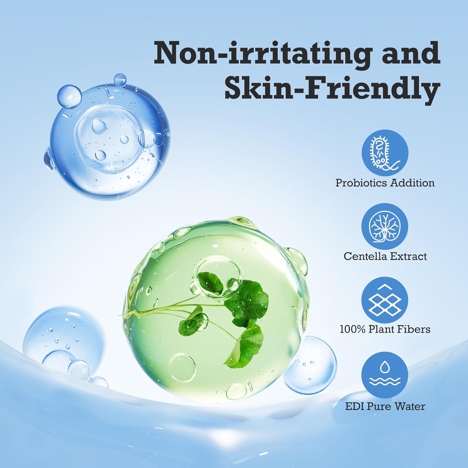 - 【Mild Formula】Our flushable wet wipes are crafted with a mild and skin-friendly formula, containing 99% pure water to provide a refreshing yet gentle and non-irritating clean. These wipes with probiotics(for skin care, not for medical purpose) and Centella Asiatica extract are free from alcohol, fragrances, and harsh chemicals, making them suitable for sensitive skin.