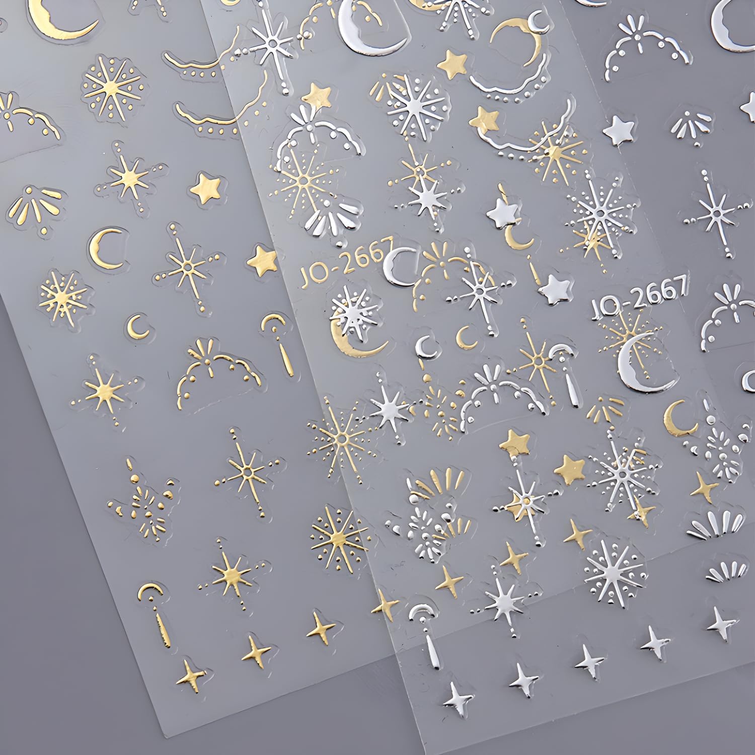 12 Sheets Silver Gold Moon Star Nail Art Stickers - 3D Self Adhesive Decals for Design and Decoration - Supplies Accessories for Women