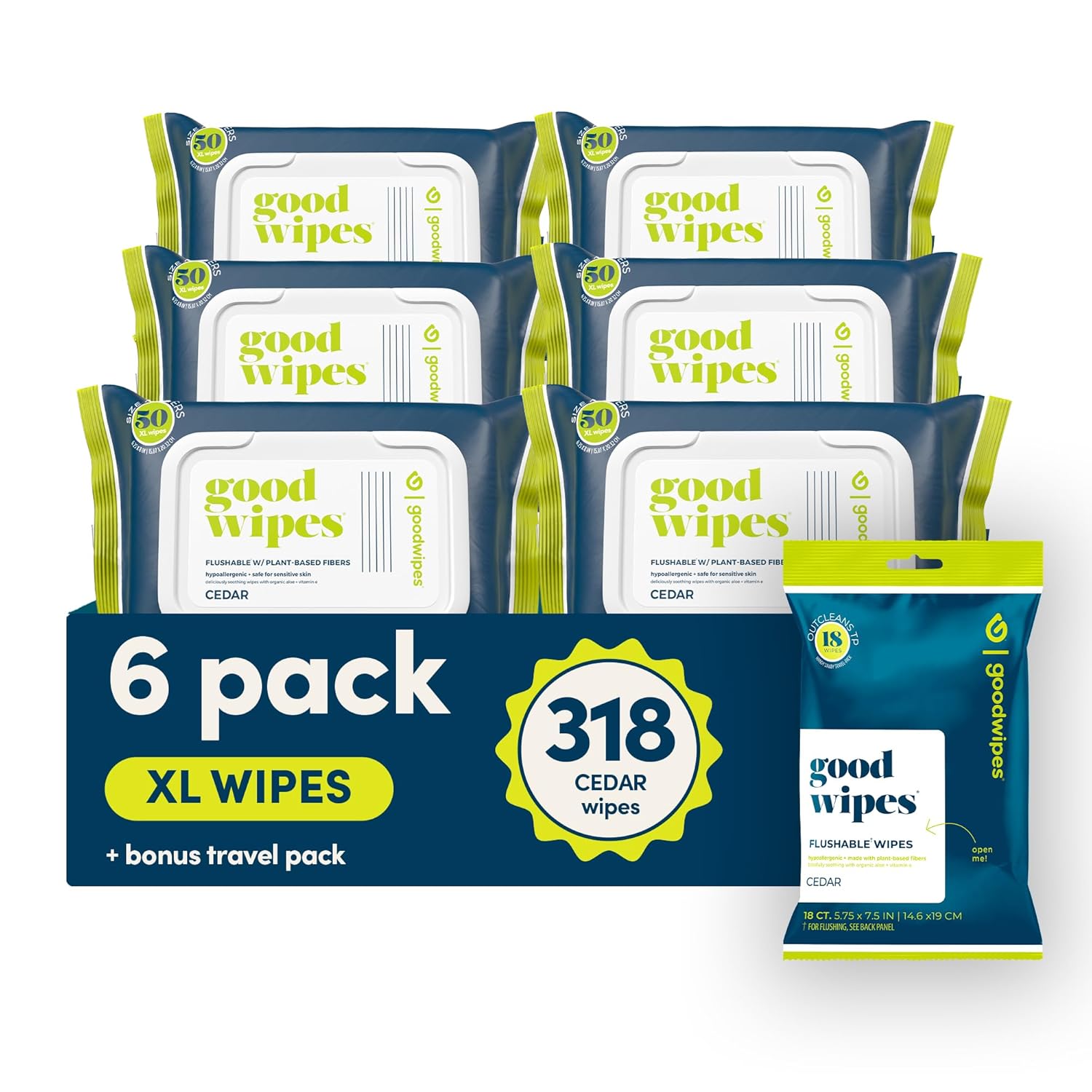 goodwipes Flushable Butt Wipes - Vitamin E & Aloe - Sewer & Septic Safe - Extra Large Adult Wet Wipes For Women & Men - Bathroom Essentials - Cedar, 318 Count (6 Packs + 1 Travel)