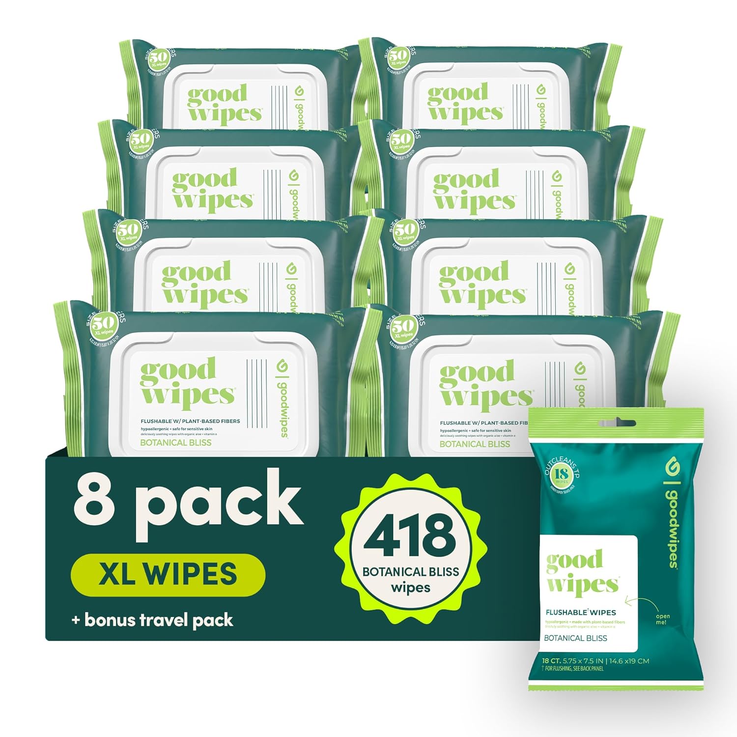 goodwipes Flushable Butt Wipes - Vitamin E & Aloe - Sewer & Septic Safe - Extra Large Adult Wet Wipes For Women & Men - Bathroom Essentials - Botanical Bliss, 418 Count (8 Packs + 1 Travel)