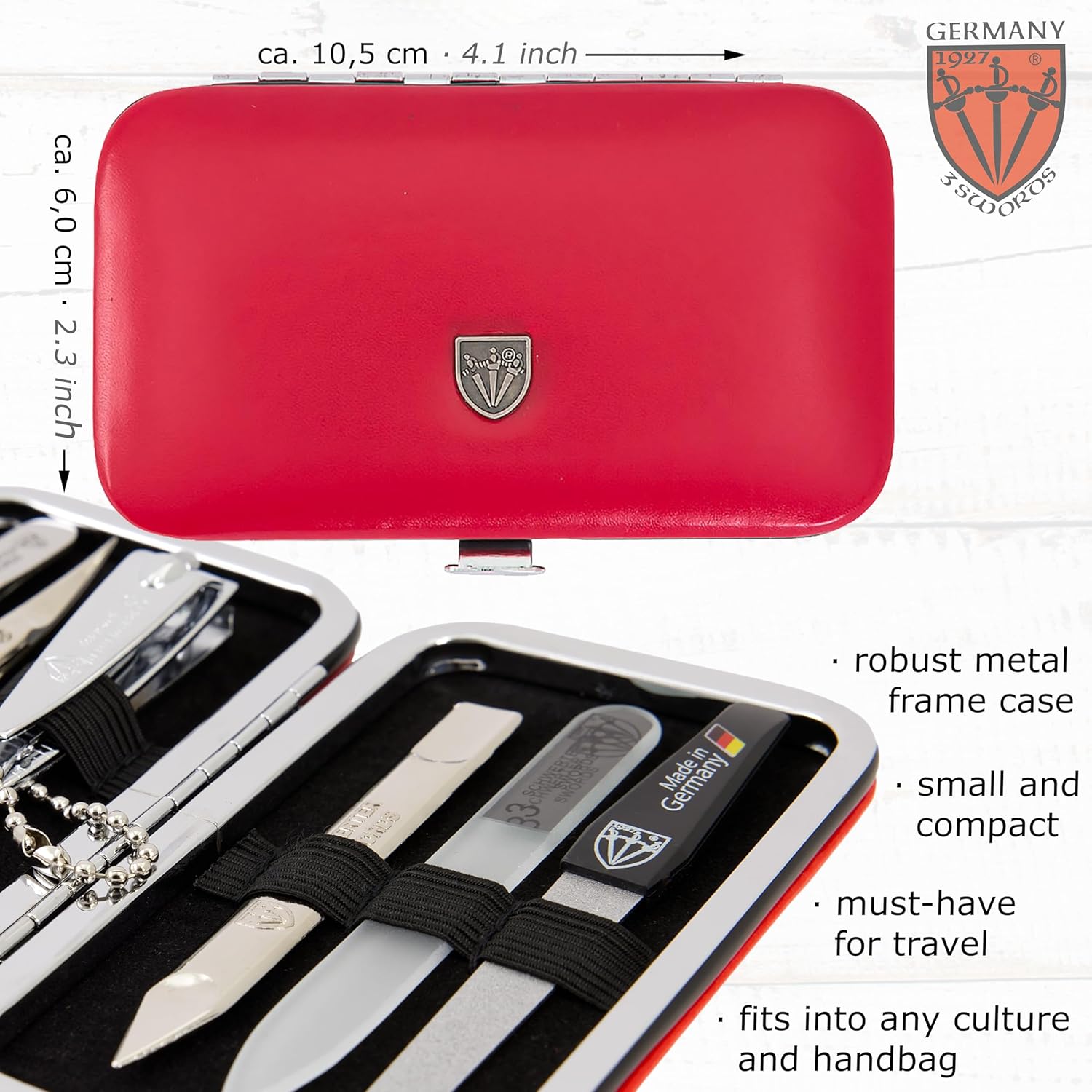 3 Swords Germany - Brand Quality 6 Piece Manicure Pedicure Grooming kit Set - Scissors, Metal and Glass Nail File, Clipper, Tweezers with Synthetic Leather case - red