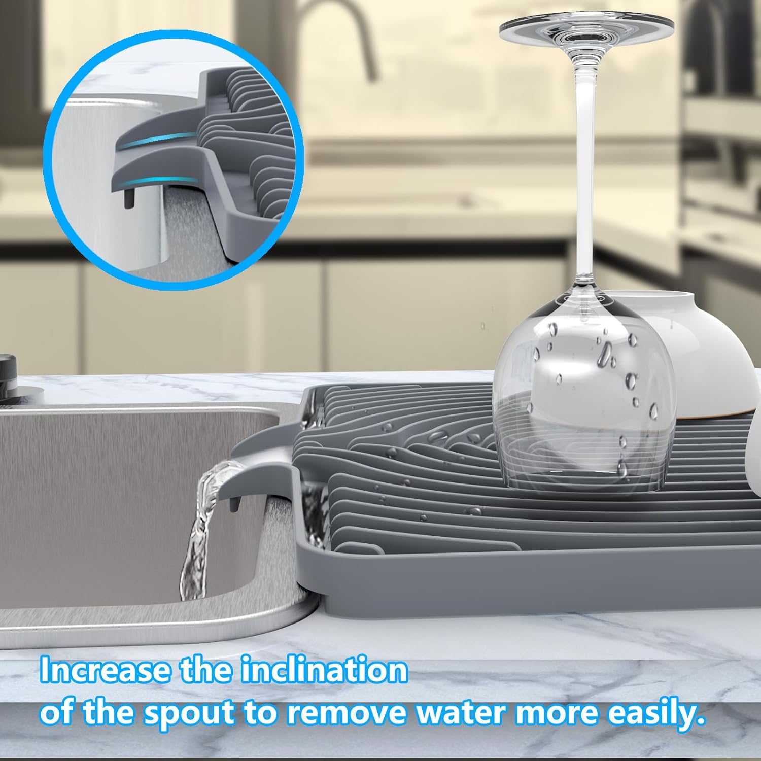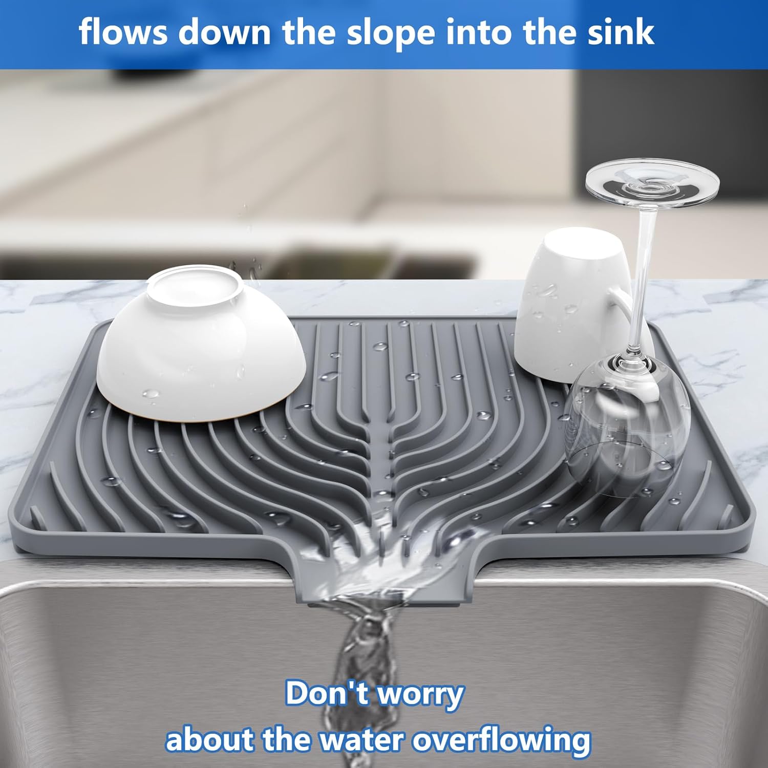 - DESIGNED FOR NON-SUNKEN SINKS: This countertop kitchen mat raises the spout and overall height for sinks with non-flat edges. Place it by your kitchen sink and direct the water from the dishes into the sink. That significantly reduces the difficulty of cleaning and drying the dish drying mat itself.