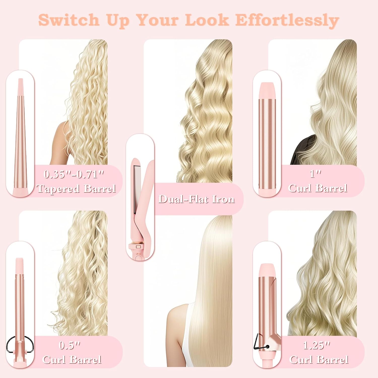 - Versatile Curling Iron Set: Ufree curling iron set offers versatile styling options and tailor your look with five precision barrels, including a 0.35-0.71 inch tapered barrel, 0.5 inch curl barrel with clip, 1 inch curling wand, 1.5 inch curl barrel with clip, and a specialized hair straightener for styling flexibility.Whether you're straightening or curling, long hair or short hair, this all-in-one set has you covered