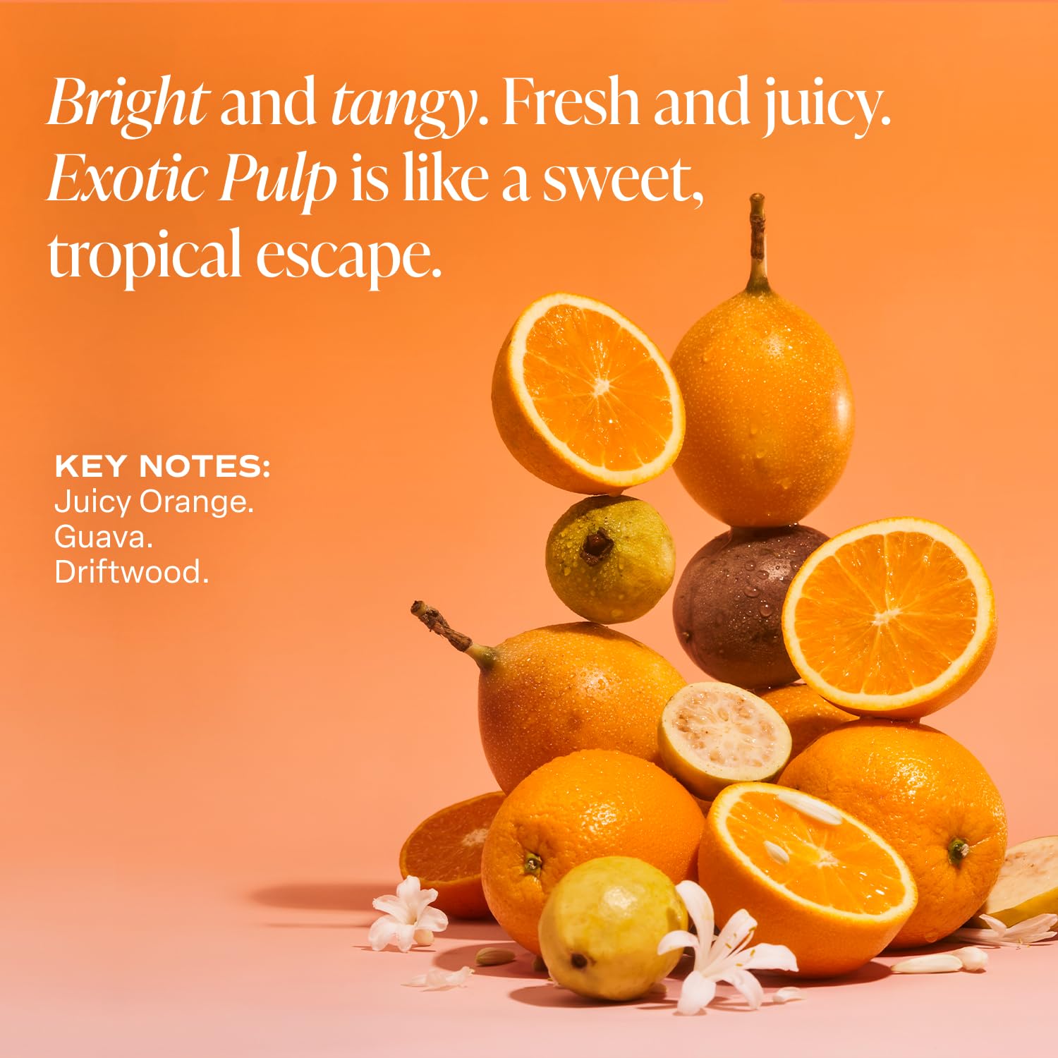 - EXOTIC PULP FRAGRANCE: Orange, Guava, and Passionfruit create a vibrant and tropical explosion of juicy citrus, sun-ripened fruit, and exotic sweetness, creating a scent that feels bright, playful, and full of energy. Exotic Pulp is bright and tangy, like an exciting tropical escape.