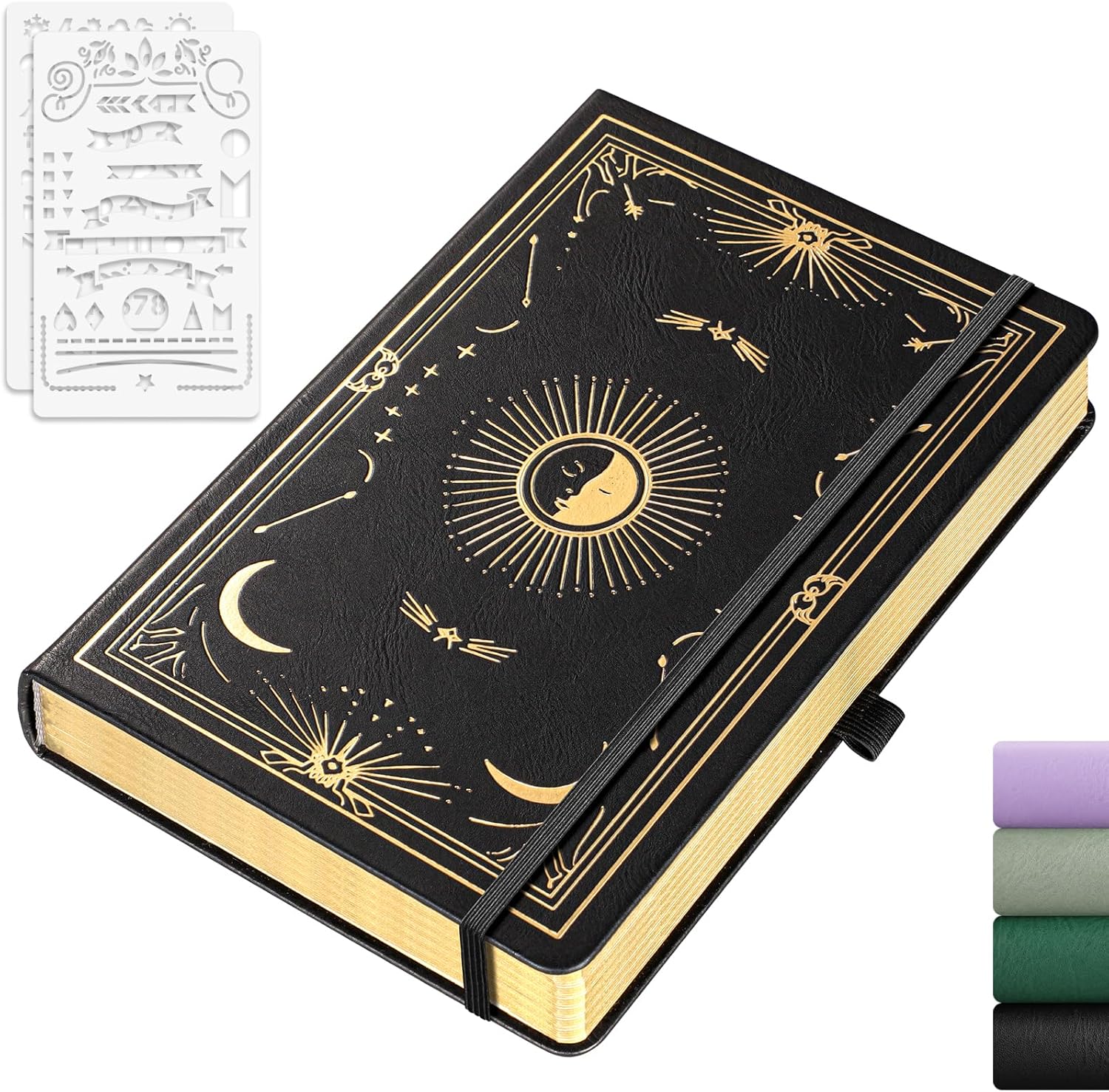 - Hardcover Design: The durable leather notebook with waterproof leather protects pages from wear. The A5 Lined journal cover is embossed with the sun and moon, adding sophistication and elegance. Measuring 5.75 in x 8.38 in, it effortlessly slips into backpacks.