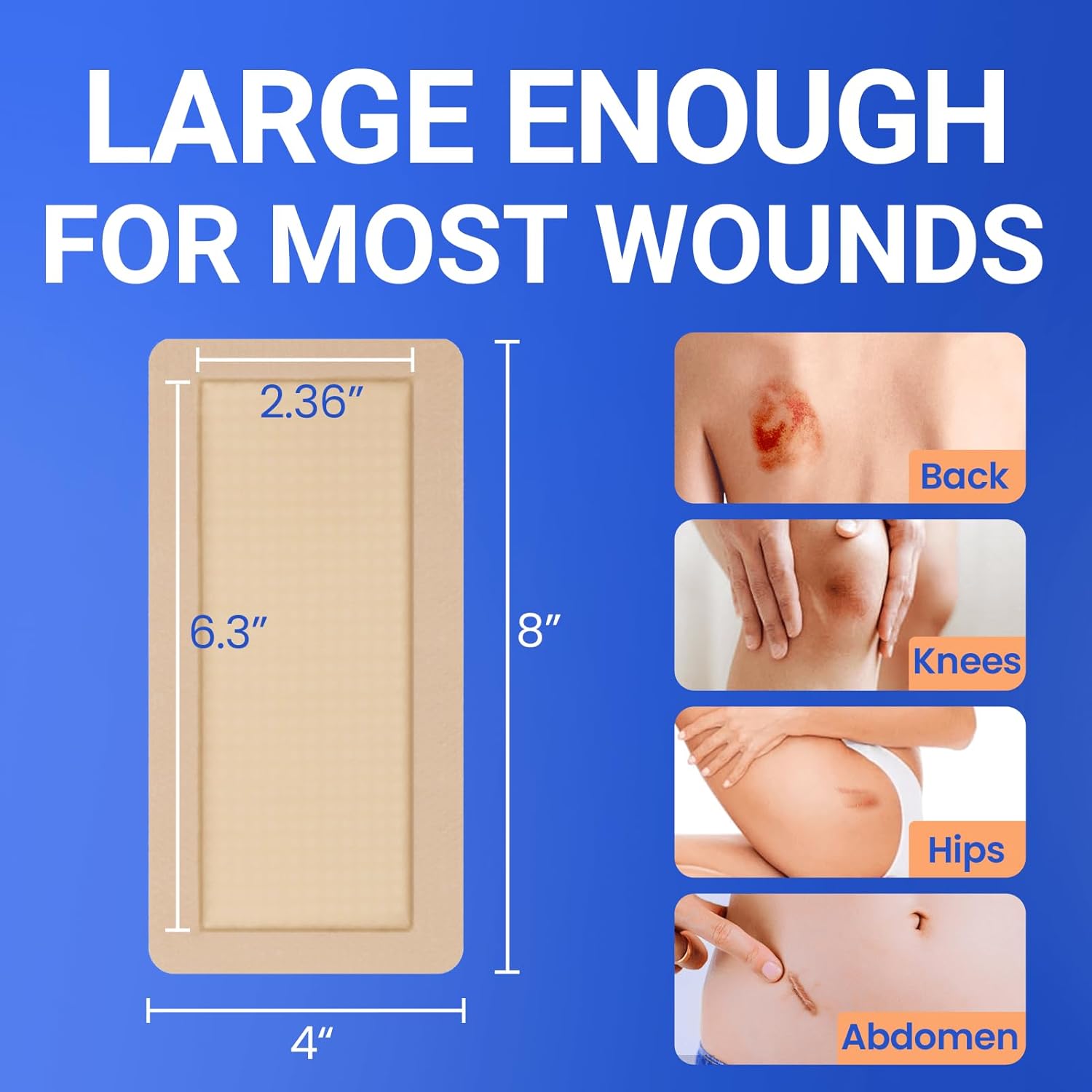 - 4X8 inches Large Enough for Most Wounds: Our bandage measures 4X8 inches (with a 2.36x6.3 inch absorbent pad), ideal for common injuries on hands, legs, and other typical wound sites, offering optimal coverage for most wounds