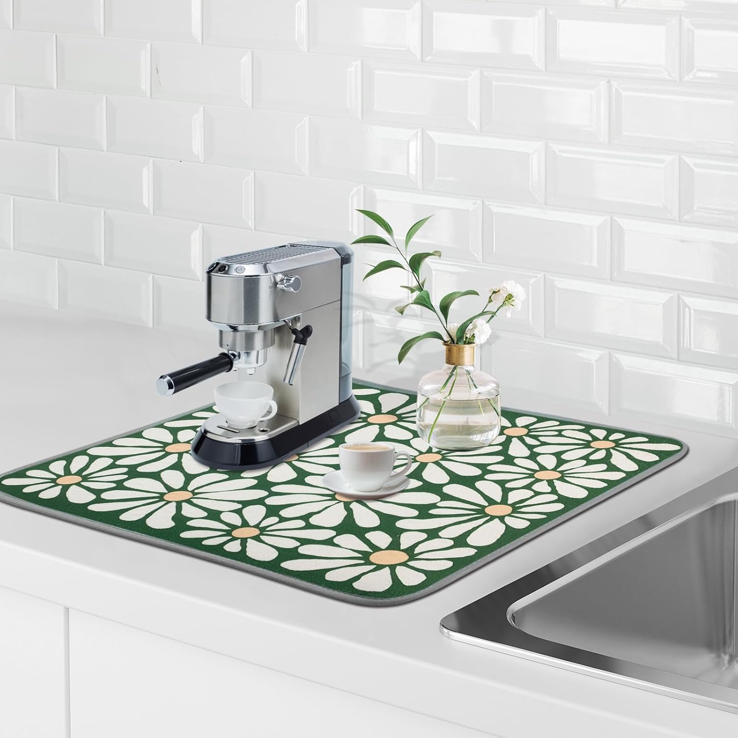 SHIYUE Dish Drying Mat for Kitchen Counter Super Absorbent Spring Kitchen Decor Microfiber Drying Matainers Rack Fast Pad Dish Drainer Mats(Green Flower,18''x24'')