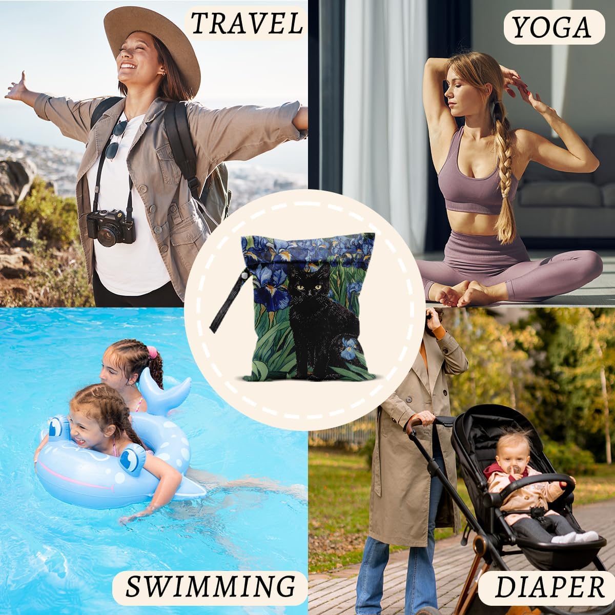 2Pcs Cat Wet Bags 12x10 Inch, Flowers Waterproof Travel Laundry Bags, Colorful Floral Reusable Wet Dry Bag for Swimsuit Beach Diapers Dirty Yoga Gym Clothes, Cat Gifts for Women Friend Travelers