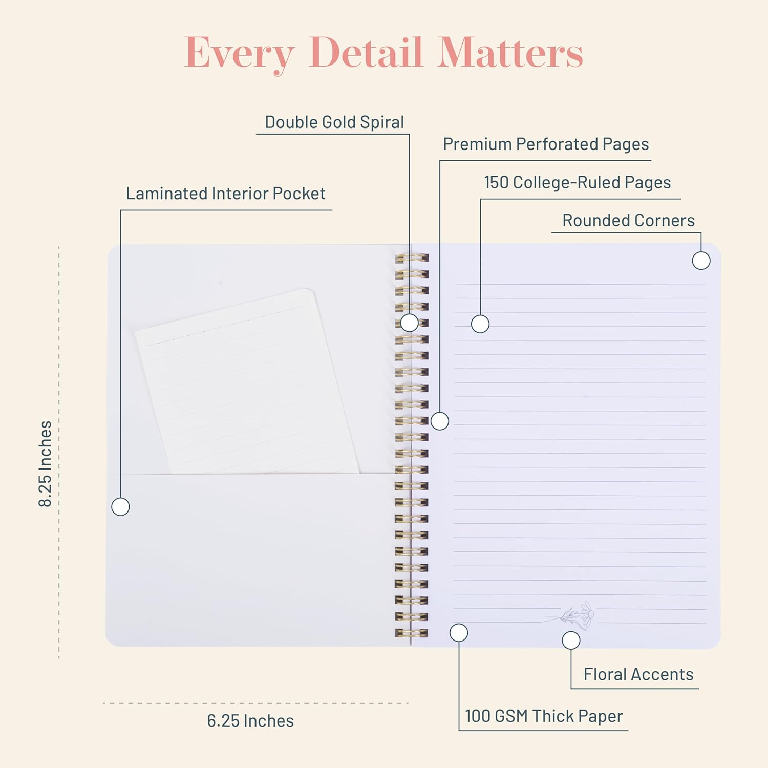 - Durable Stylish Cover: The durable spiral binding keeps pages secure while allowing our hard cover notebook to lay flat for smooth writing. Its pretty cover, combined with laminated interior pockets, adds style and functionality.