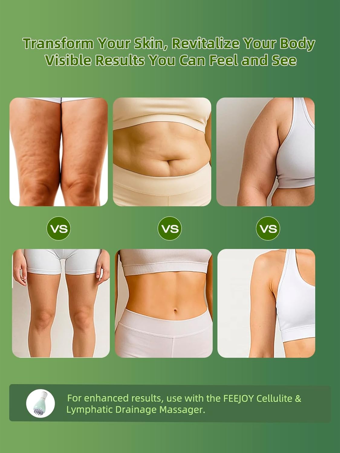 - Massage Oil for Therapy & Circulation Boost: A perfect companion for manual or tool-assisted massage. Promotes detox through improved circulation and lymphatic drainage. For best results, pair with the FEEJOY Cellulite & Lymphatic Drainage Massager to enhance absorption and elevate your routine.