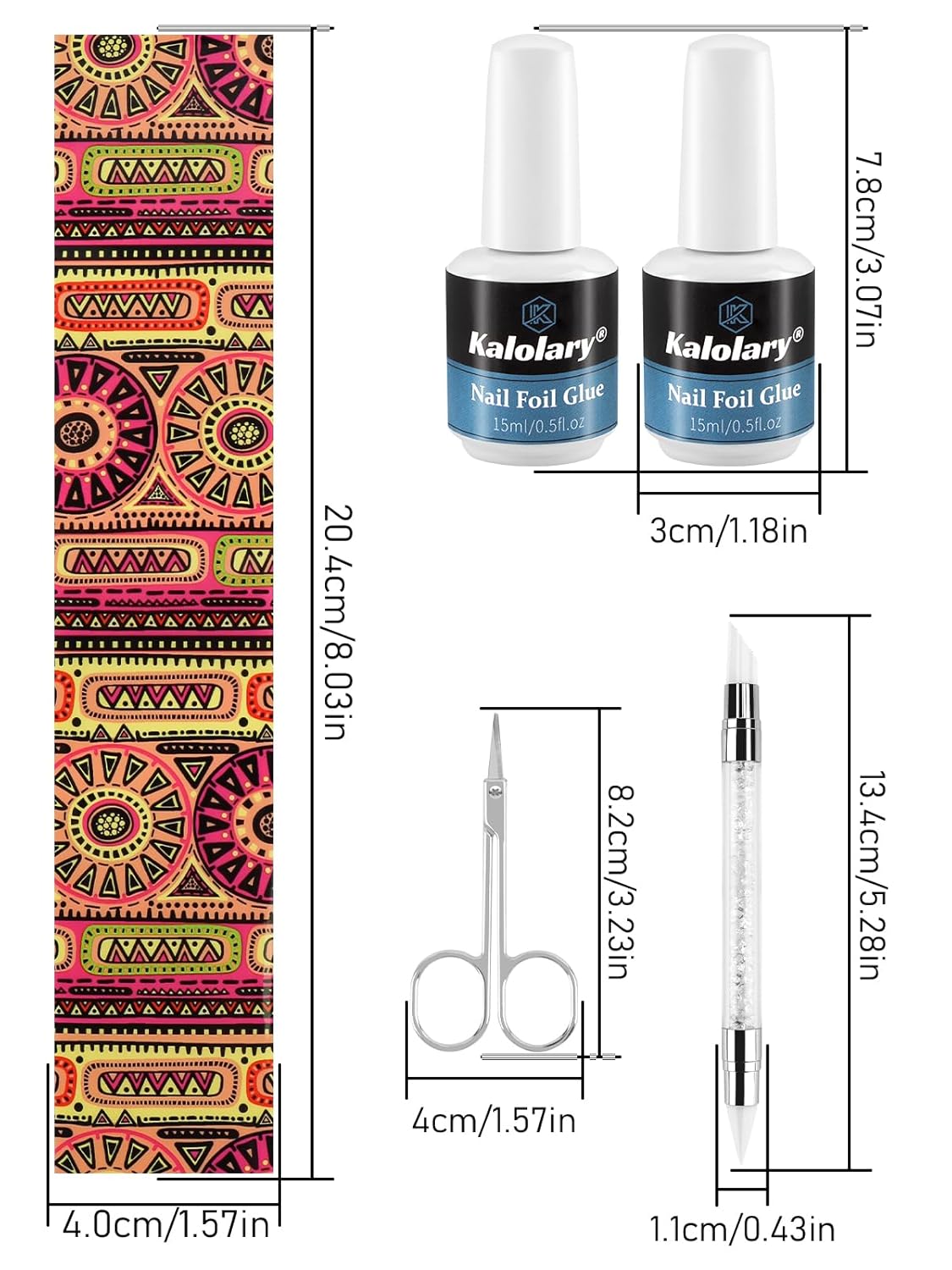 - NAIL ART FOIL STICKERS SET - 80 Pcs nail foil transfer sticker + 2Ă—15ML nail glue + 1Ă—nail press pen + 1Ă—sticker scissors. 80 unique foil designs for you to reate countless eye-catching nail patterns.