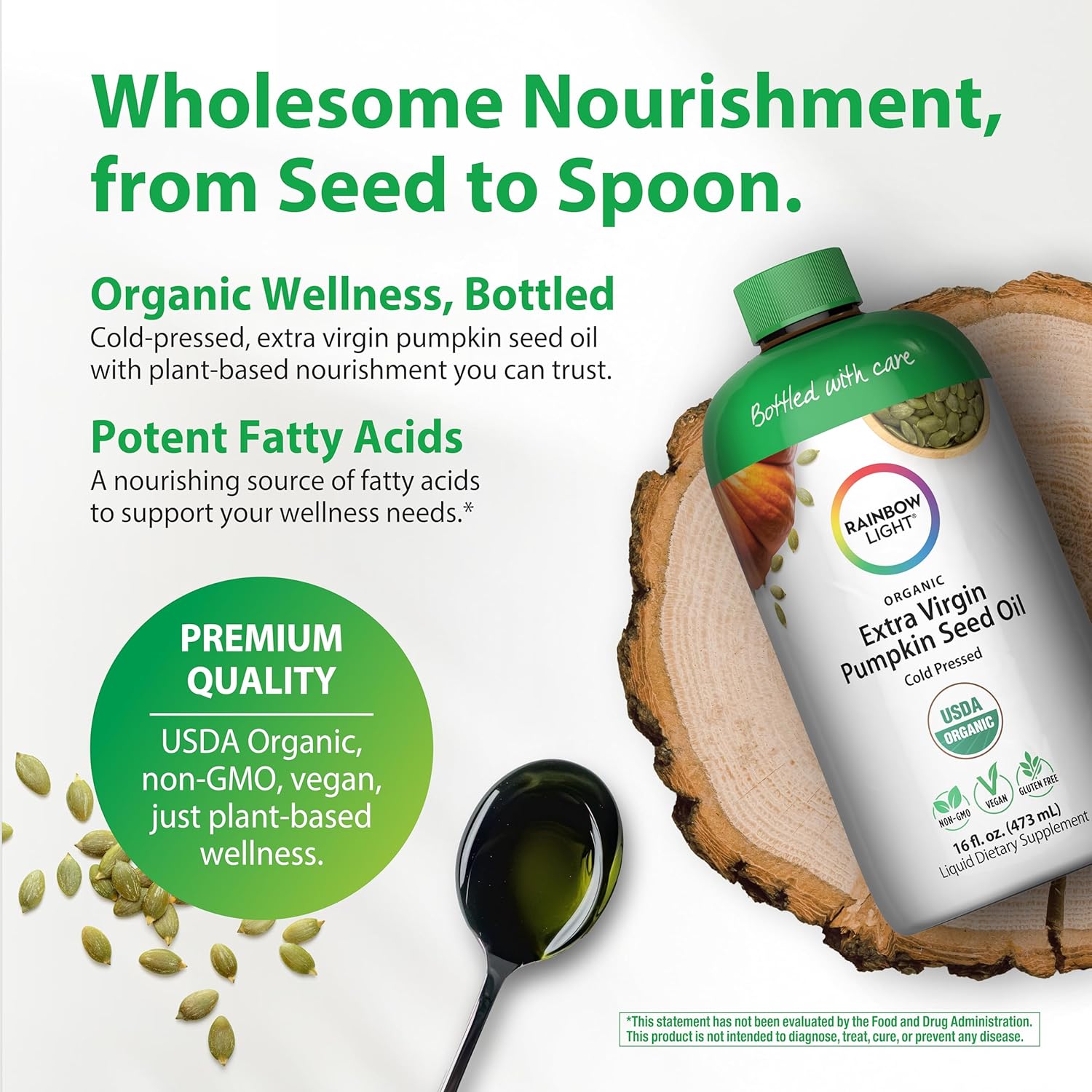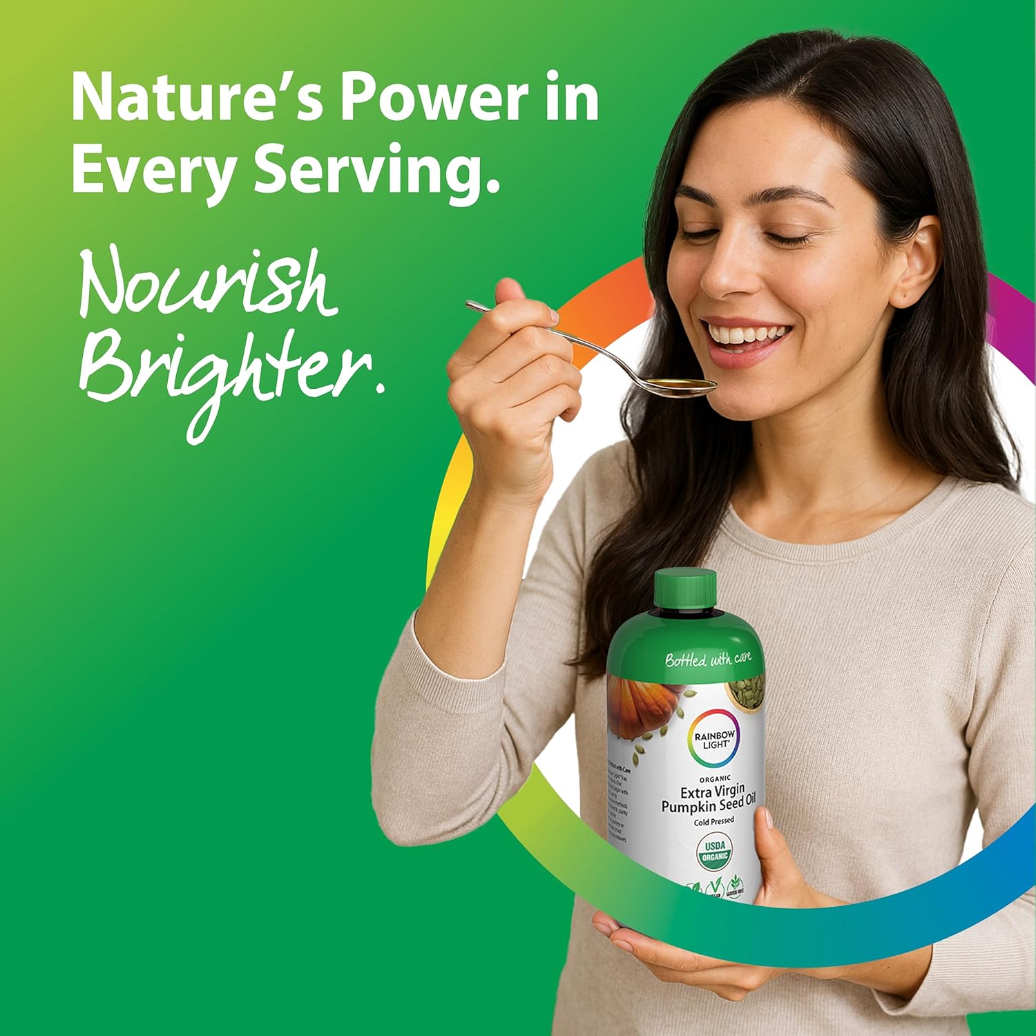 Rainbow Light Organic Extra Virgin Pumpkin Seed Oil | Cold Pressed Liquid Extract | Potent Source of Omega 6 and 9 Fatty Acids | Non-GMO and Gluten Free Supplement | 16 Fl Oz