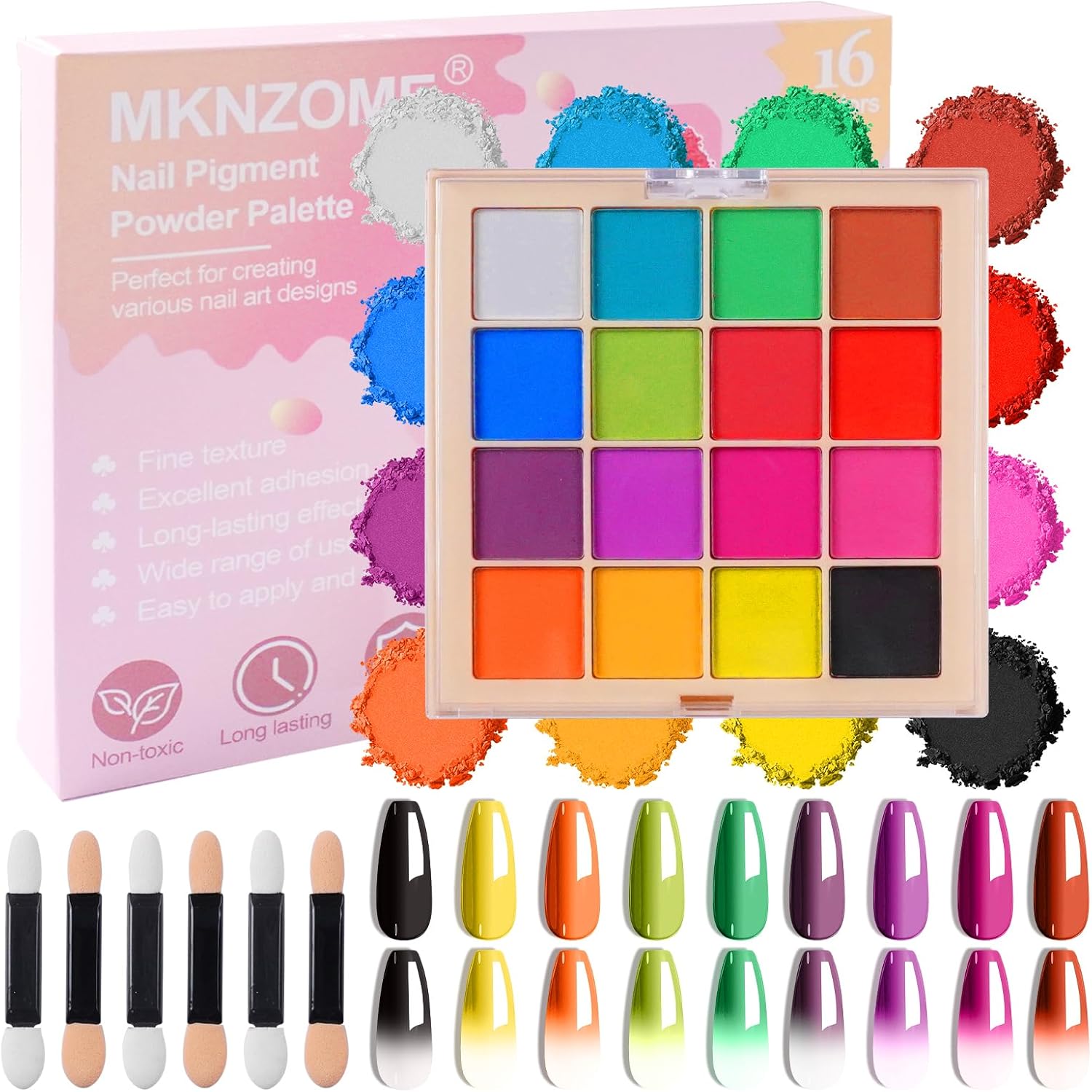 - 【Vibrant Nail Pigment Powders】Enhance your nail art creations with the MKNZOME pigment powder for nails. This set includes a range of highly pigmented powders that will bring vibrant colors and stunning effects to your nails. You will get a 16-color palette and 6 double-ended sponge brushes for nail painting.