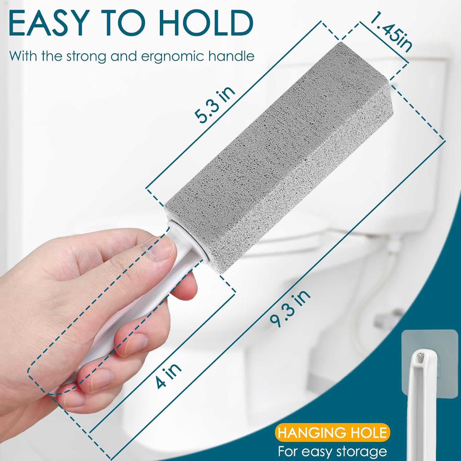 - ERGONOMIC EASY-GRIP HANDLE: Crafted from PP plastic, the pumice stone for cleaning is shaped to naturally fit most hand sizes. The ergonomic handle of the toilet bowl pumice stone provides secure and comfortable control, easy to grab, a hole at the end allows convenient hanging storage