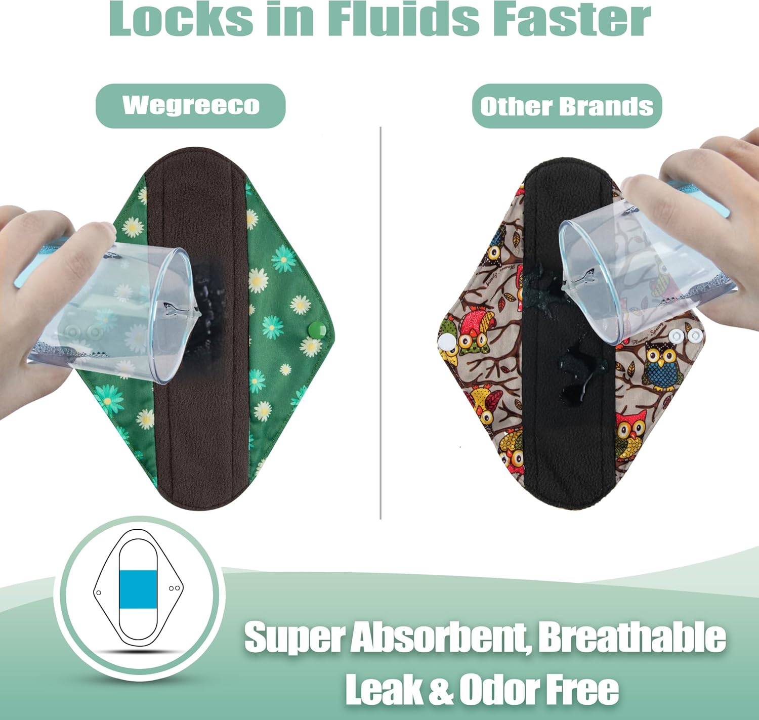- CHARCOAL INNER LAYERS of these cloth menstrual pads is soft with maximum and have a stay dry surface; The dark color is forgiving of stains and Not only great at soaking up liquid, smells are neutralized; Middle layers microfiber make this reusable sanitary napkin super absorbent