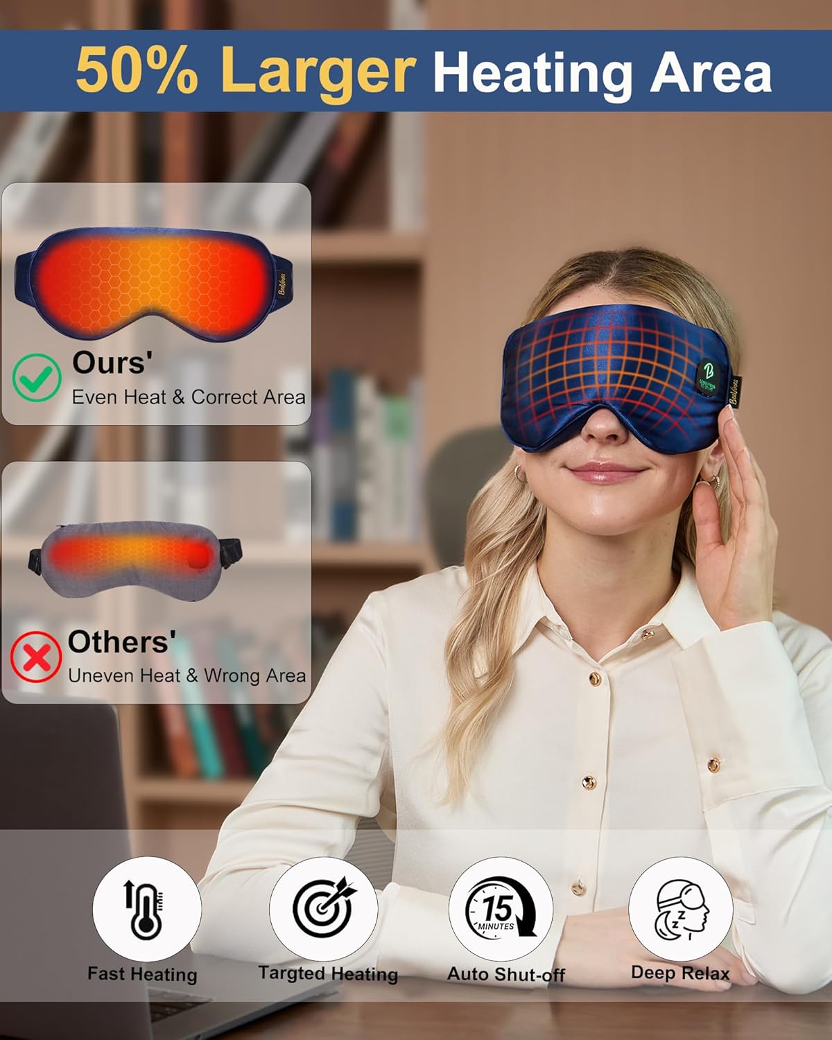 - Engineered for Precision Thermal Therapy - BeeVines' patented heating system revolutionizes eye care with a 30% wider heating area & precision wiring that delivers targeted 108°F warmth exactly where needed (entire eye area) - unlike competitors that waste heat on foreheads. This complete-coverage design melts gland blockages 25% faster than standard masks, stimulating full oil flow to effectively relieve dry eyes, styes & strain - with zero wasted heat or positioning guesswork.